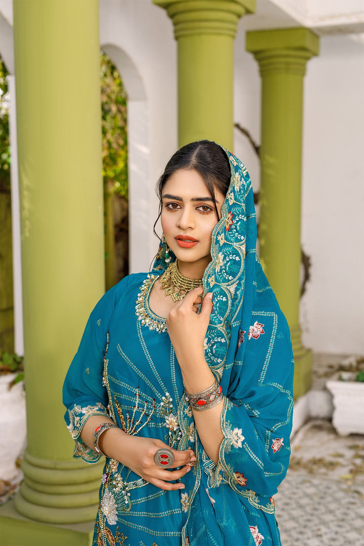 Embroidered Sequins Chiffon Front with Heavy Hand Embellishment including Neck chain