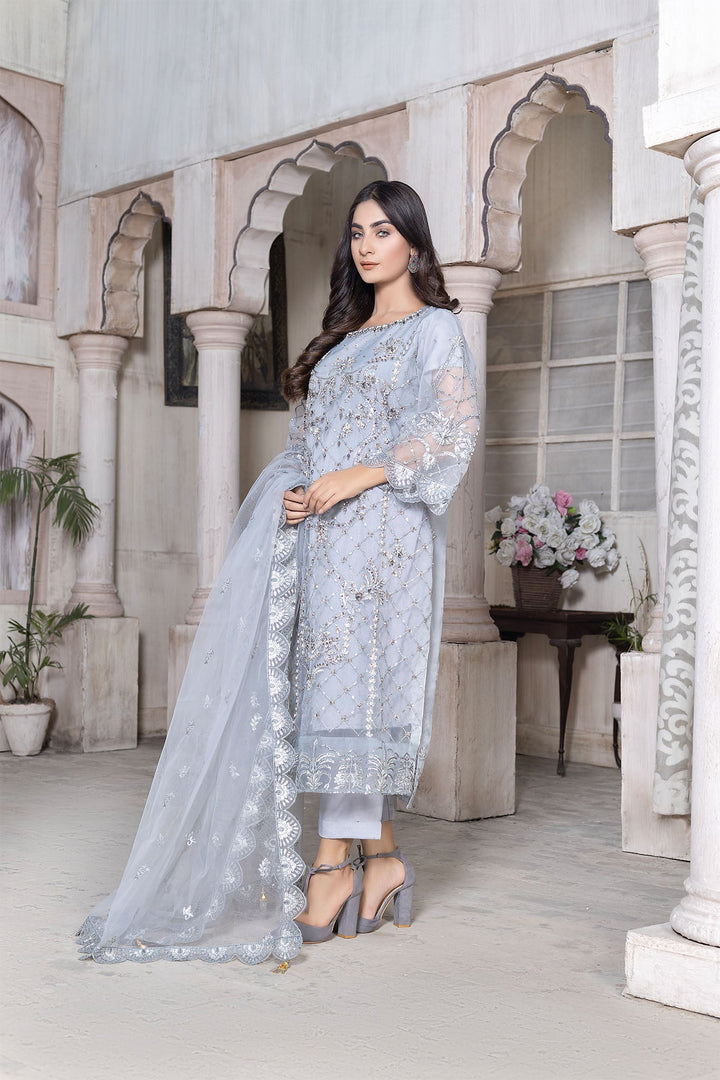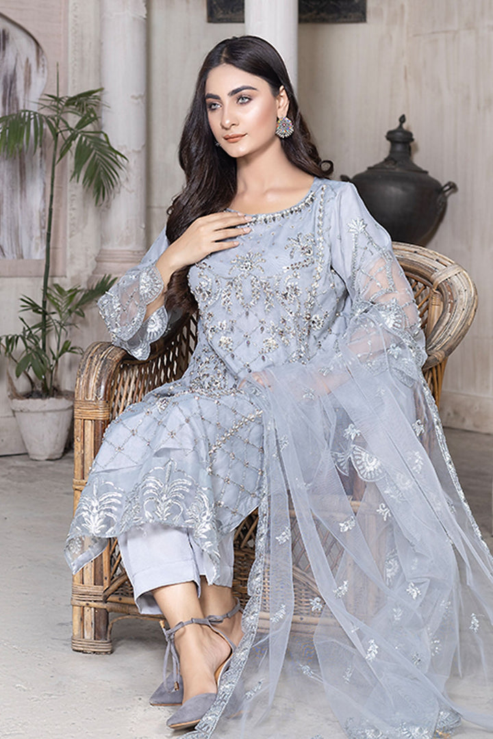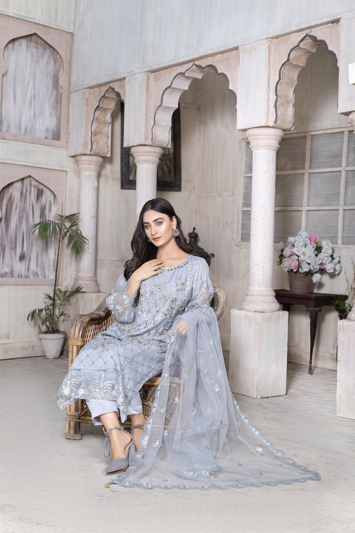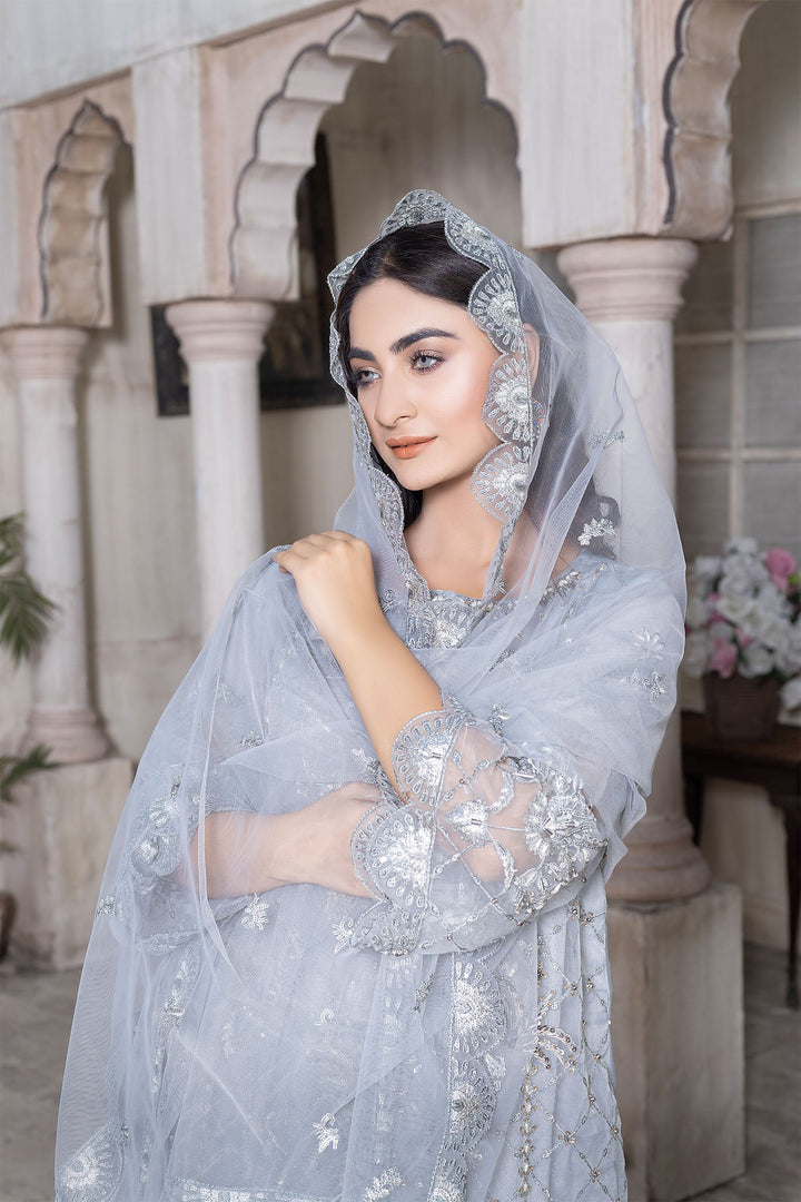 side of the shirt is elaborated with Kora Dabka’s handwork while the back side has small patches on distance. The sleeves have pretty decorative embellishments in the same color. To complement this piece, the embroidered net dupatta adds elegance to it. With excessive embroidered work, the grip trouser in pure color seems perfect. This fabulous piece is available at Ketifa in the wedding dresses online category.