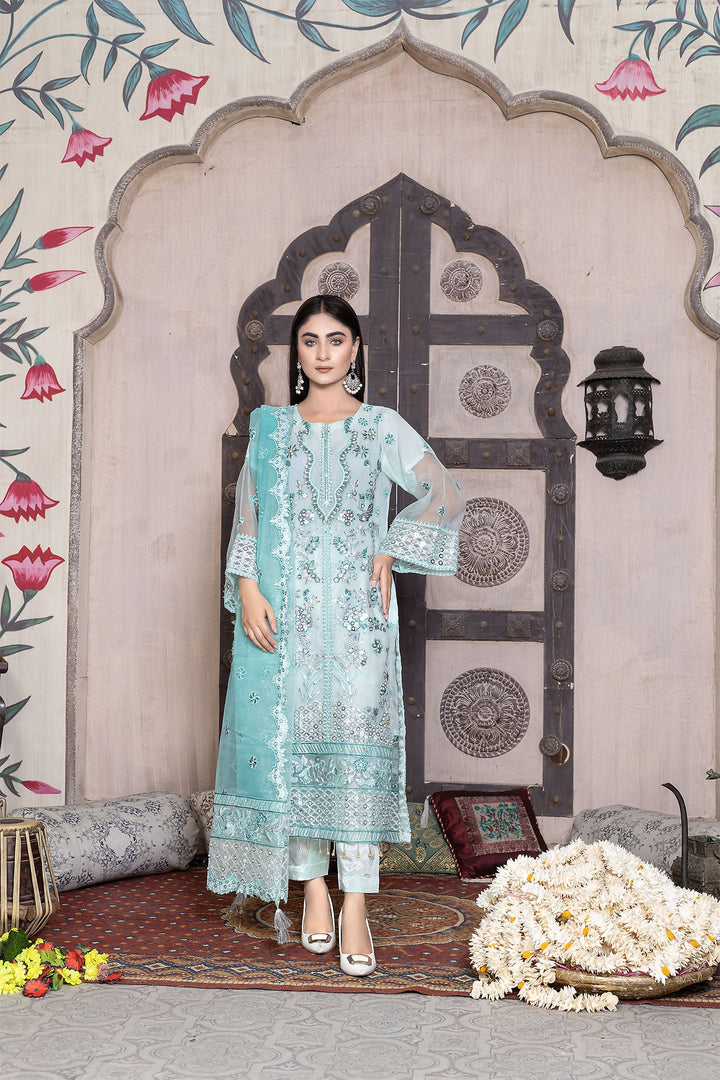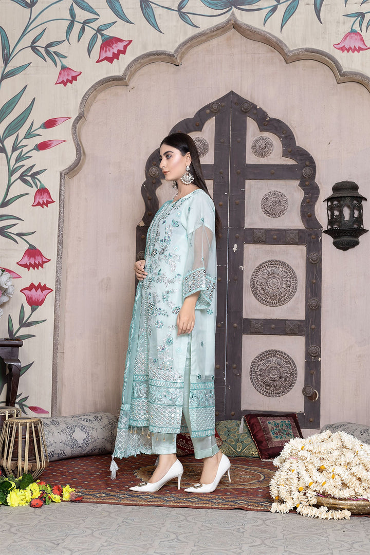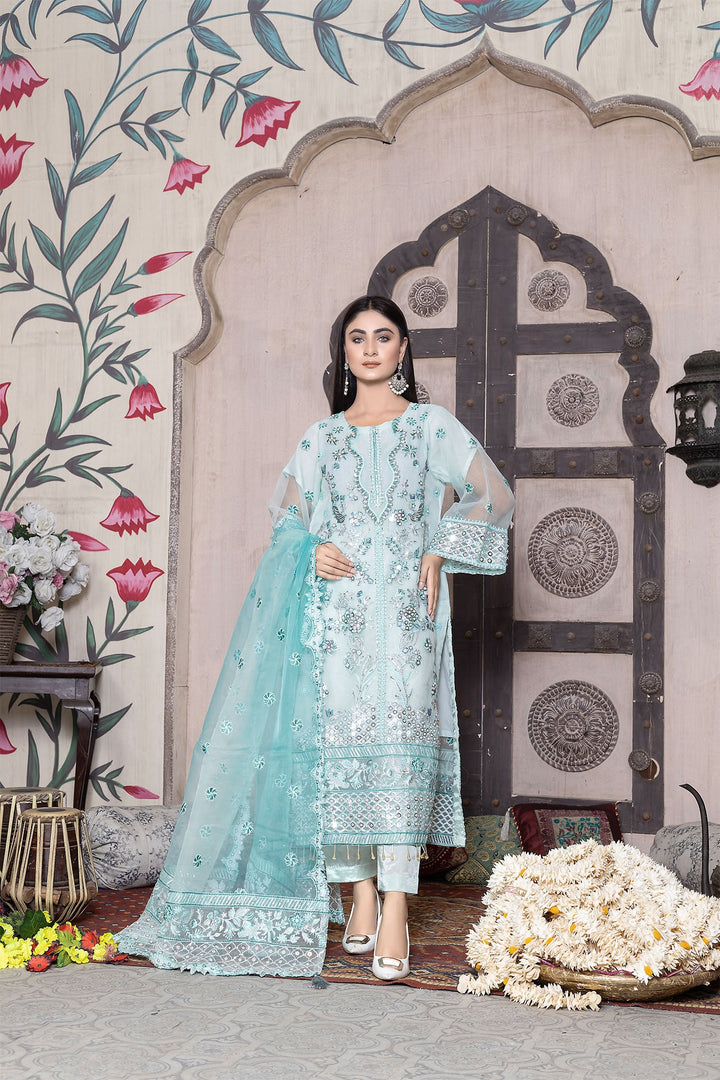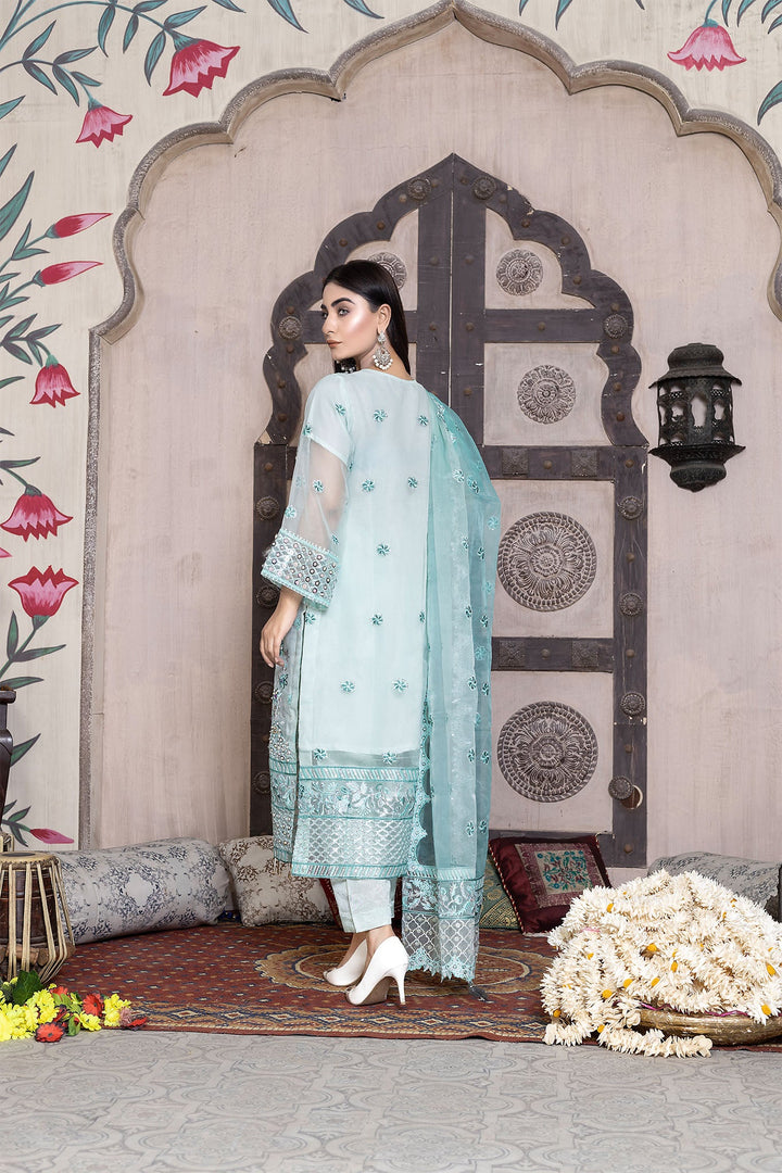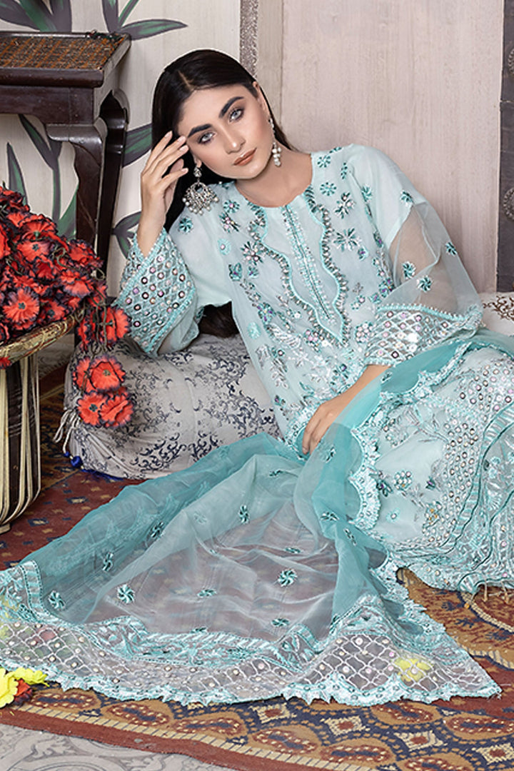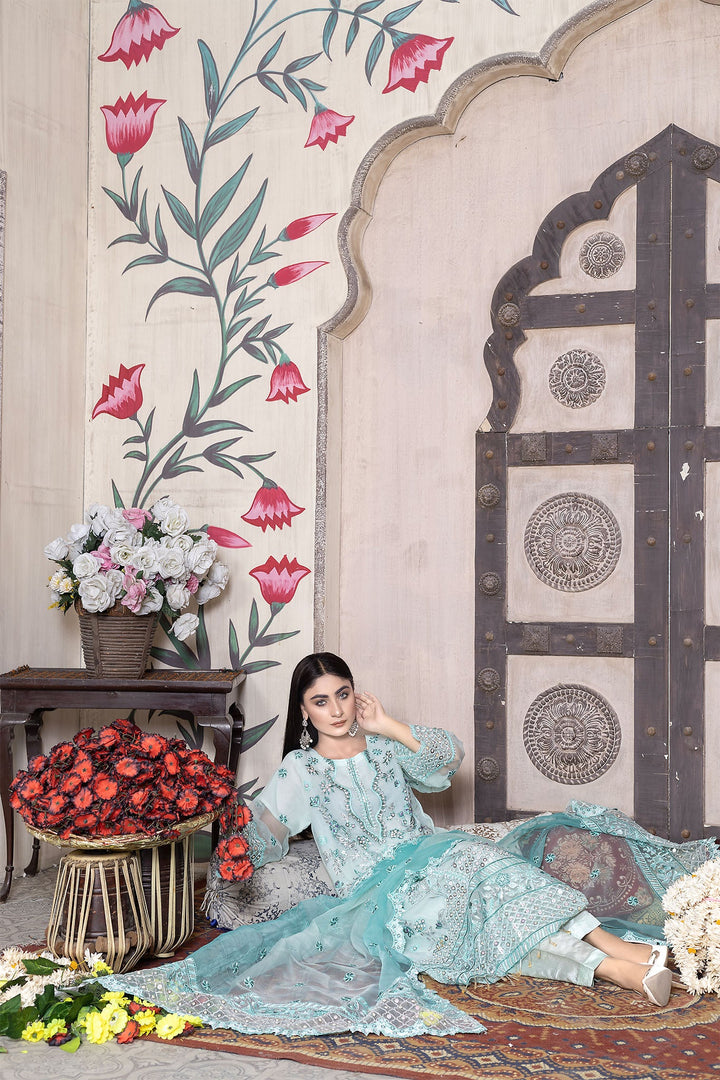 organza dresses are decorated with delicate silver pearls on them. This fabric feels divine against the skin in this warm weather and keeps the joyous spirit alive. The sleeves of this amazing dress have broad sequins with small flowers on the overall length. The archetype of modishness is completed with the organza dupatta having cross-stitch work on the corners. The plain grip trouser also comes in a matching color.