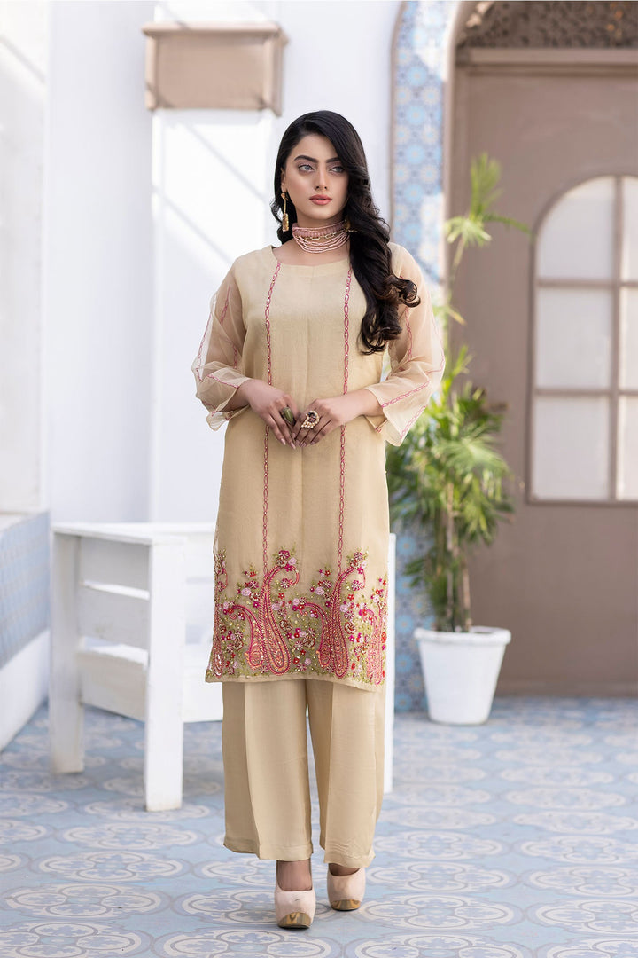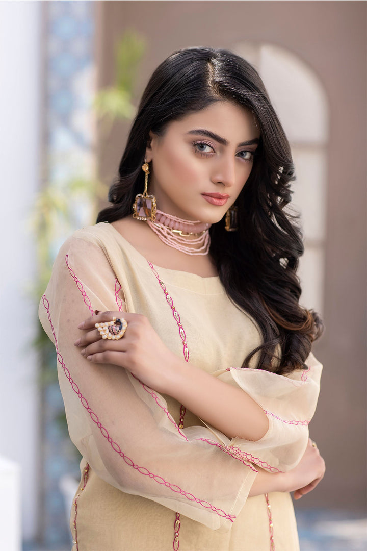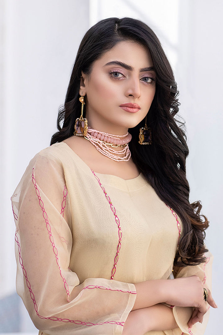Organza’s Pastel colors never go out of fashion and can be suitable in any season. This subtle pink delicate embroidery two-piece dress will give you an elegant expression at the event. Long thread-crafted dark pink lines on the front and back with broad work on the front daman completes this sophisticated look. The dress is available in all three small, medium, and large sizes.