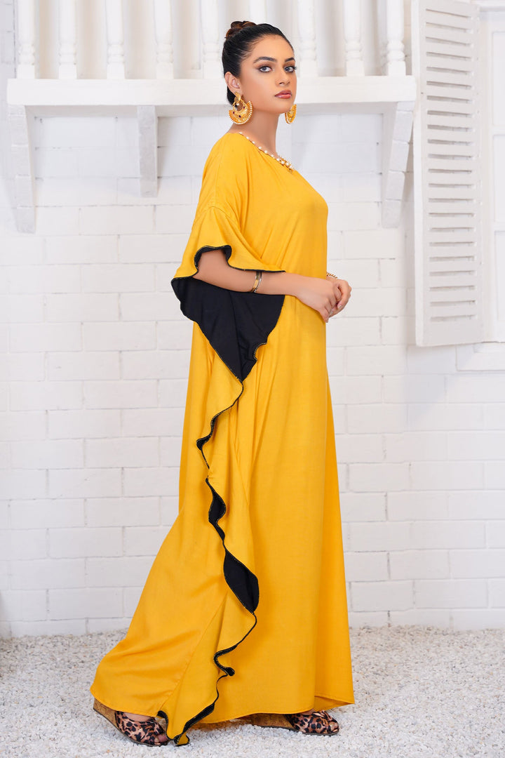 This is an absolutely stunning kaftan made in grip georgette is in a bright mustard yellow tone, accented with black finishing. The neckline is ornamented with understated handwork to create a flashy effect.