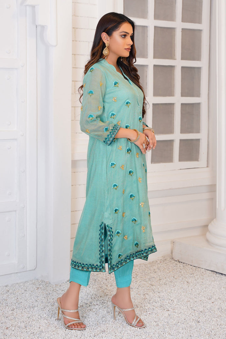 This shirt on zari cotton net creates a dreamy effect with its embroidery and gotta work.