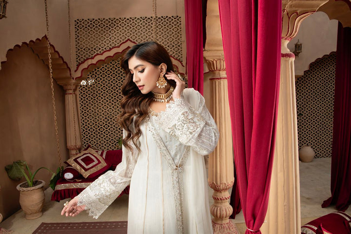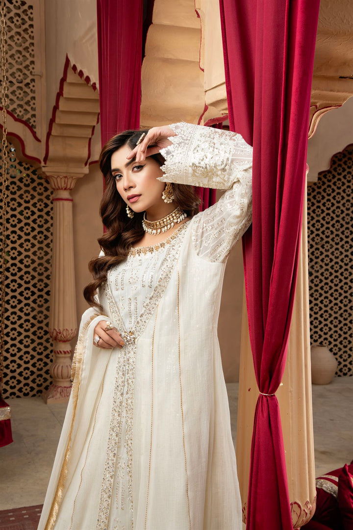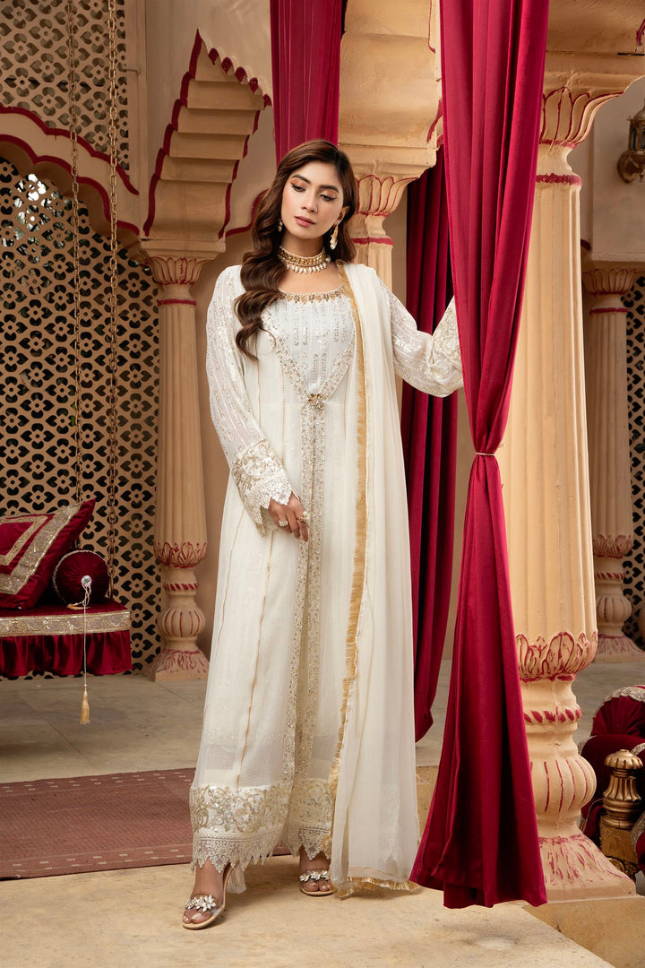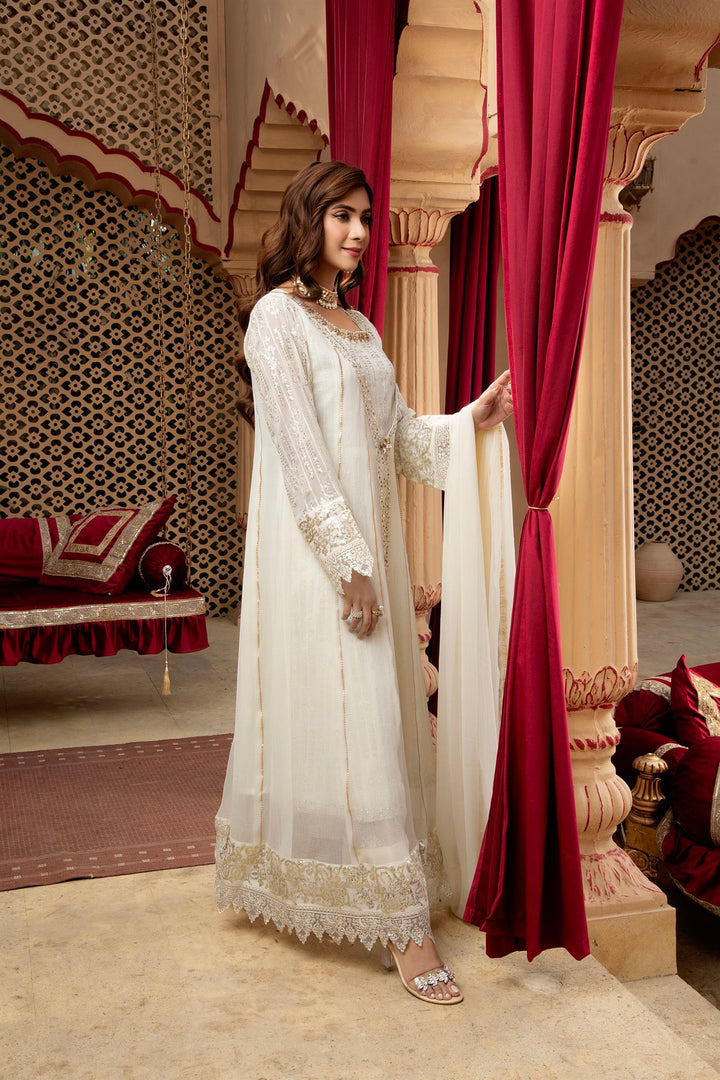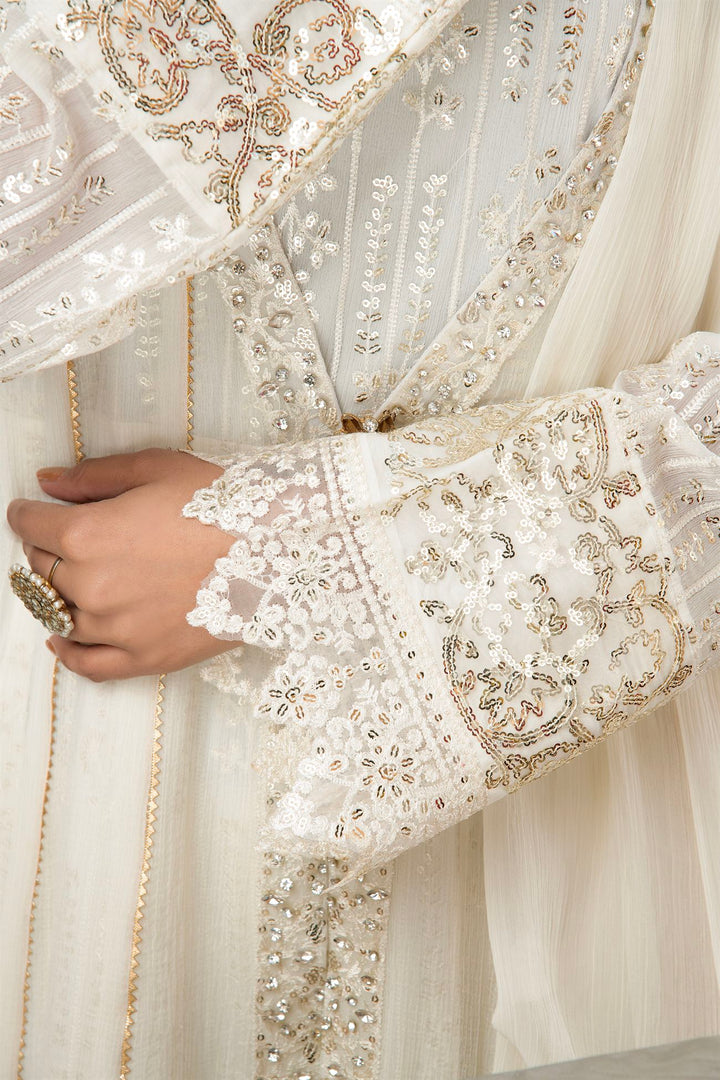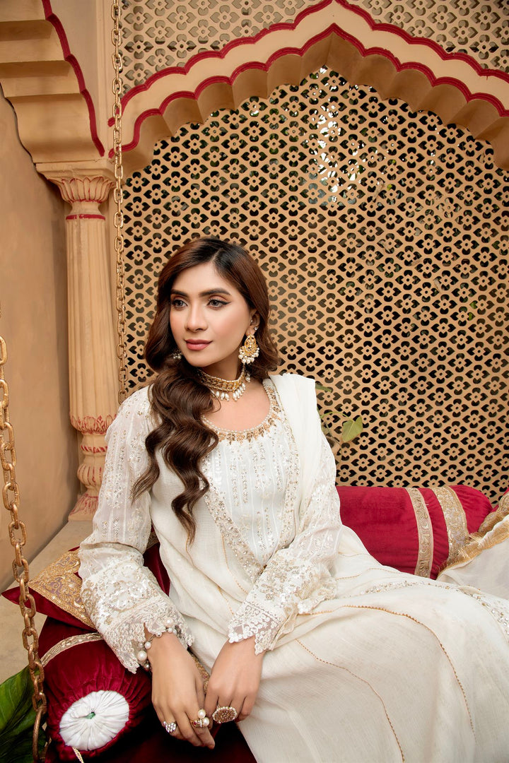 There is exquisite embroidery work in vertical patterns, which exudes grace and elegance, is a marvel of craftsmanship and design. The designer's exquisite use of the sitara, stone work and sequin embroidery technique enhances this lovely dress. A gorgeous chiffon dupatta with a kiran lace border completes the ensemble. Make use of Mona Embroidery to showcase your individual style and embrace it.