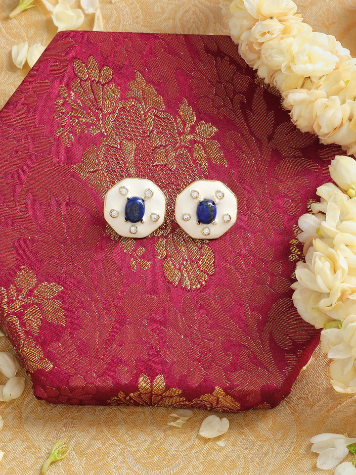Delight in understated luxury with these 21K gold-plated earrings, featuring natural lapis stones, sparkling zircons, and intricate handpainted details.