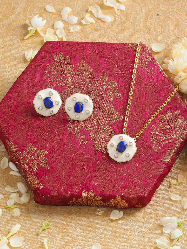 Refined and radiant, this 21K gold-plated pendant showcases a natural lapis stone accented with shimmering zircons and intricate handpainted details when paired with a chain.