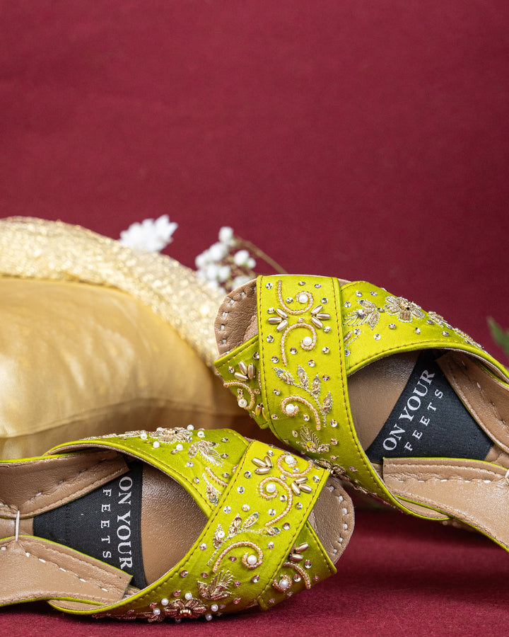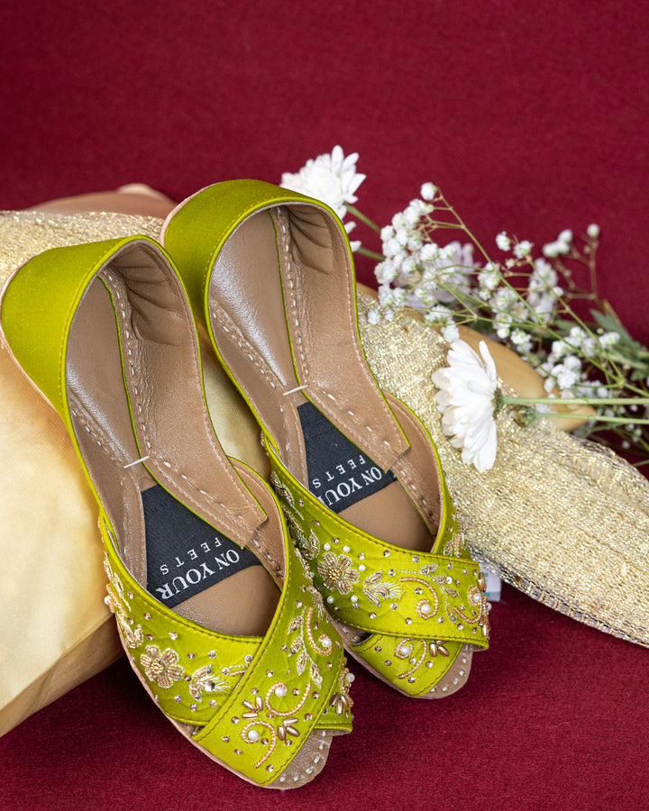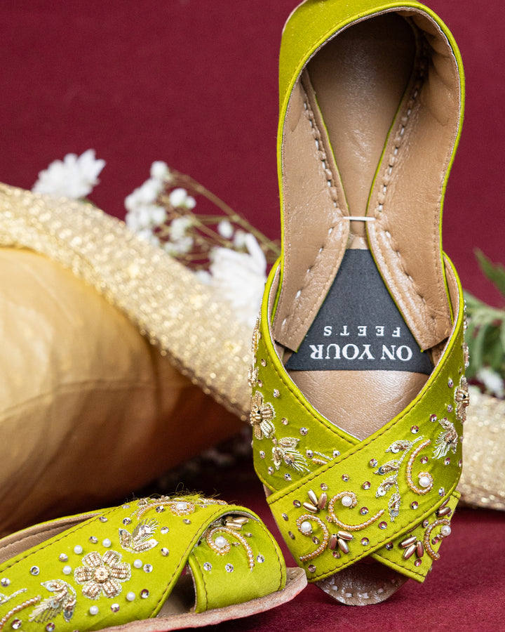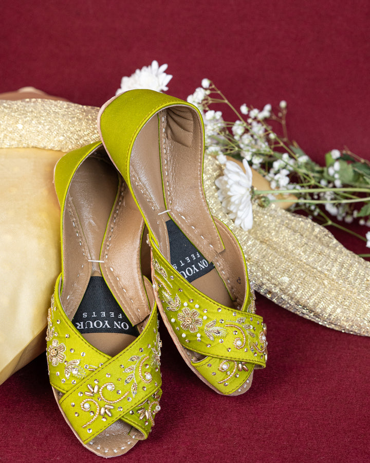 Enhance your ethnic charm with these stunning lime green embroidered khussa. Featuring exquisite gold thread embroidery, delicate beadwork, and shimmering embellishments, these handcrafted shoes are designed to make a statement. The crisscross strap design adds a contemporary twist to the traditional silhouette, ensuring a stylish and comfortable fit. Made with high-quality materials and a cushioned sole, these juttis are perfect for weddings, festive occasions, and special celebrations.