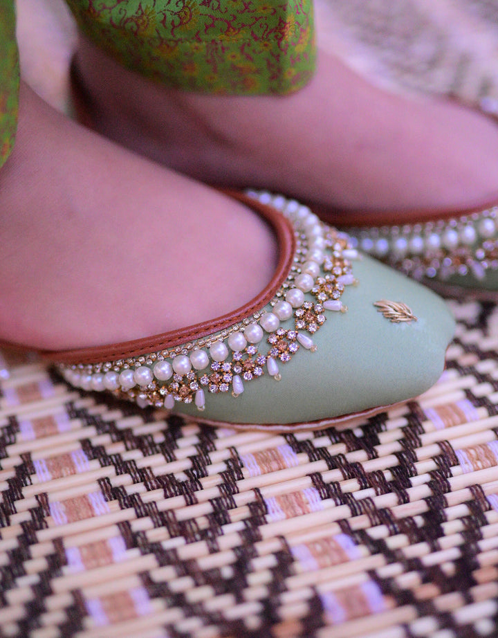 ???? All-over pearl & bead floral embroidery ???? Crisp white base fabric ???? Double cushioned leather āœ‹ Handcrafted by skilled artisans
