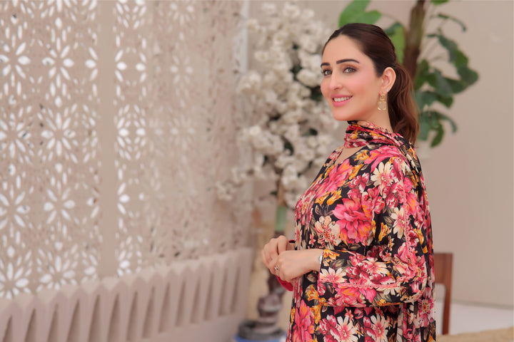 The article includes:Unstitched 3PCDigital Printed Shirt 3 yardsDigital Printed Chiffon Dupatta Digital Printed Trouser 2.5 yards