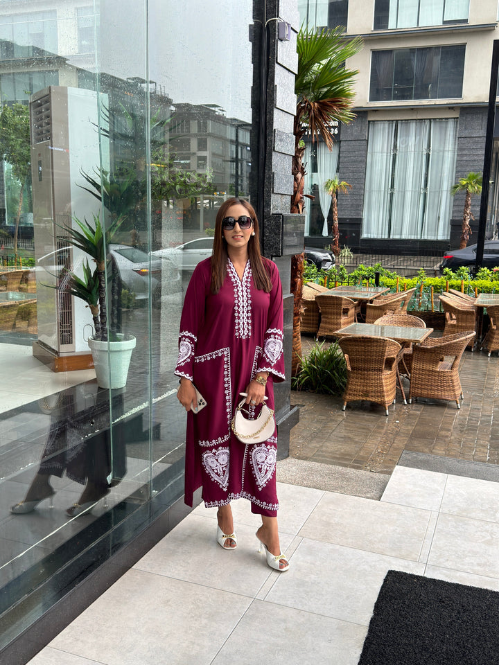 Manahils By ALLECHANT Introducing 'burgundy embroidery shirt a shirt that blends comfort with style seamlessly. Crafted from premium imported crepe Georgette fabric, its unique pattren design with white embroidery a touch of bohemian flair to your wardrobe. Versatile and effortlessly chic, 'Embroidery' embodies the essence of semi formal sophistication, making it a must-have for those who appreciate fashion with a free-spirited edge.'