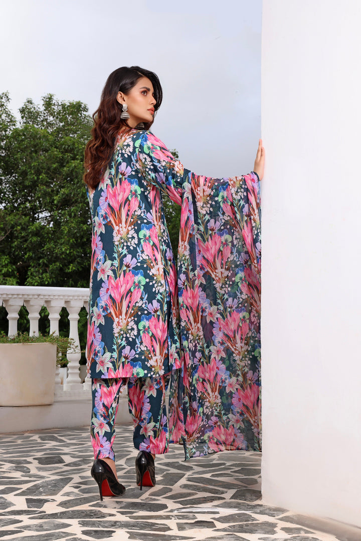 The article includes:Unstitched 3PCDigital Printed Shirt 3 yardsDigital Printed Chiffon Dupatta Digital Printed Trouser 2.5 yards