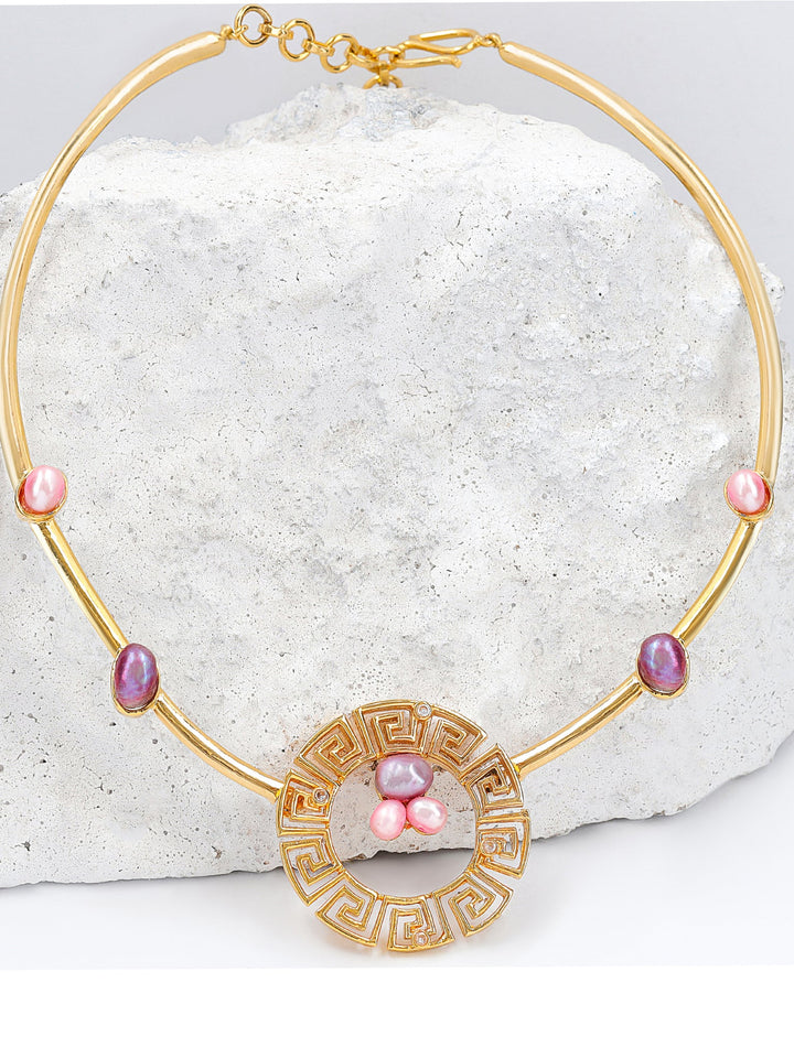 Embrace the new era of timeless jewelry designs with the creativity of our Meraki Necklace. Exclusively handcrafted for you to make a bold statement, mesmerizing motif of Greek patterns with the adornment of classic colored baroque pearls. Pair this with the matching earrings and declare your individuality.
