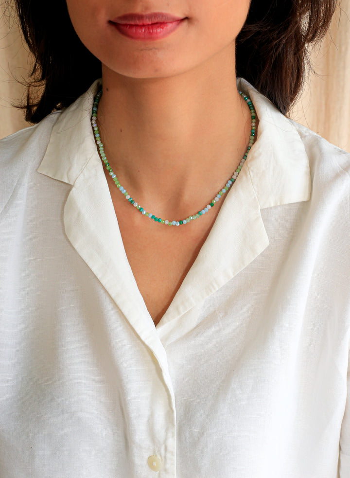 A beaded crystal necklace made with 2mm crystals in enchanting shades: Forest, Midnight, Rainbow, Sky, Storm, and Universe. Reflects light and energy with every turn.
