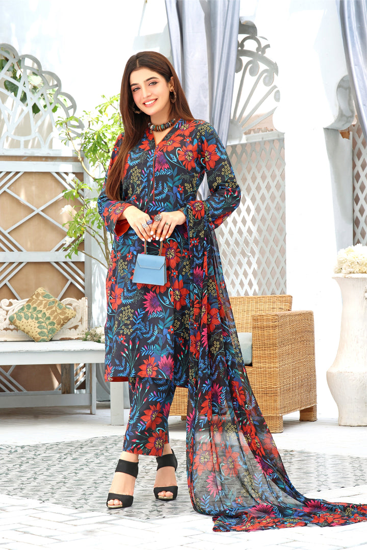 The article includes:Unstitched 3PCDigital Printed Shirt 3 yardsDigital Printed Chiffon Dupatta Digital Printed Trouser 2.5 yards