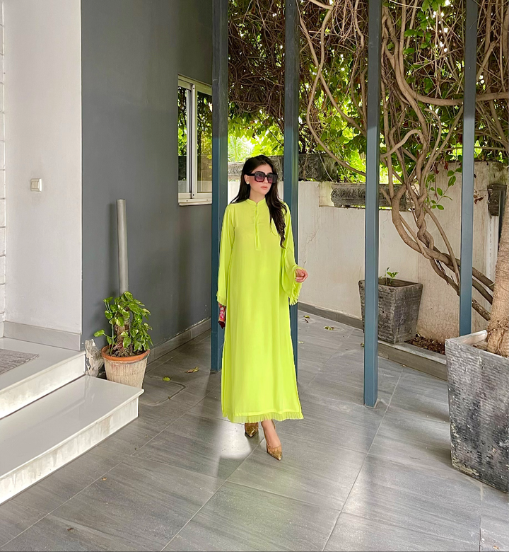 Introducing Neon Fringes by Manahils By ALLECHANT Clothing. This rare and attractive neon green color is a best seller in Pakistan. Elevate your style with this unique piece.