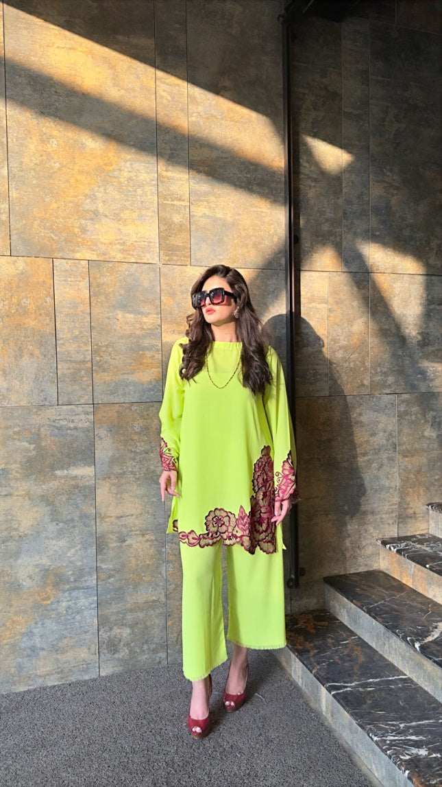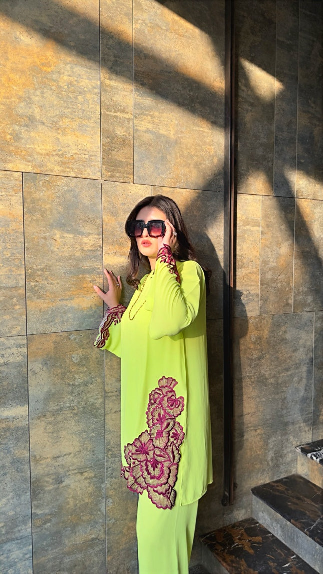 Beautiful fusion of colour combination, embroidery on short shirt with hand made threaded cullotes.