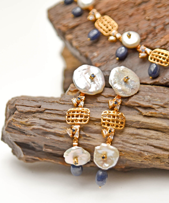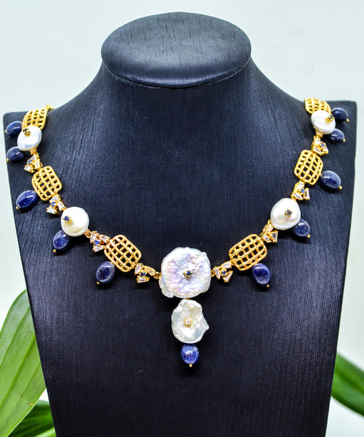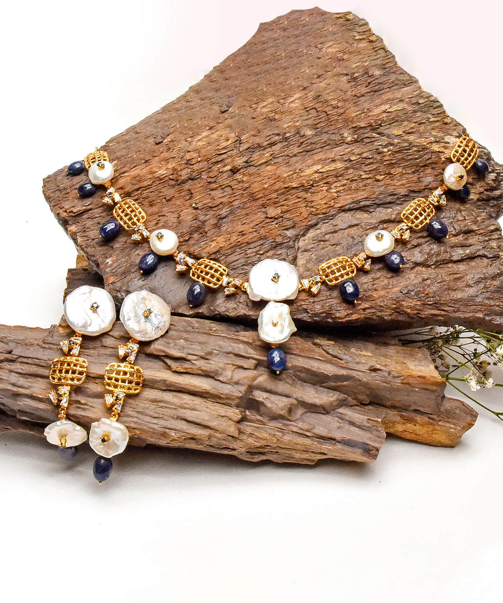This alluring piece is hand-crafted to perfection. Freshwater Pearls in contrast with Natural Blue Sapphires depict a scenic view of a full moon night, peaceful yet grand to look at.