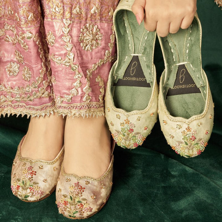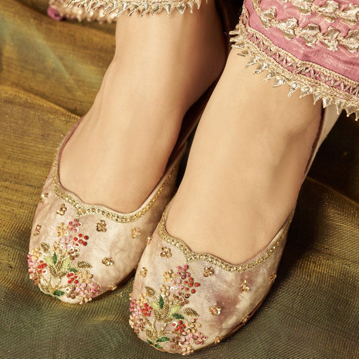 Introducing our exquisitely handcrafted floral embroidered khussas. These elegant shoes feature a delicate array of colorful blossoms and leaves, meticulously stitched onto soft, pink tie & dye fabric. The intricate beadwork adds a touch of sparkle and sophistication, while the scalloped edge, embellished with fine gold thread, enhances the luxurious feel of these khussas. Perfect for special occasions or adding a touch of glamour to everyday wear, these juttis combine comfort and timeless beauty. The soft, cushioned insole ensures all-day comfort, while the durable sole provides excellent support. Elevate your footwear collection with these stunning embroidered juttis that bring artistry and elegance to your style.
