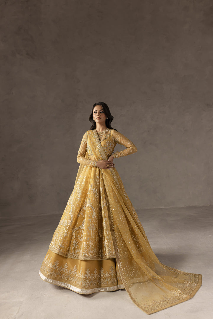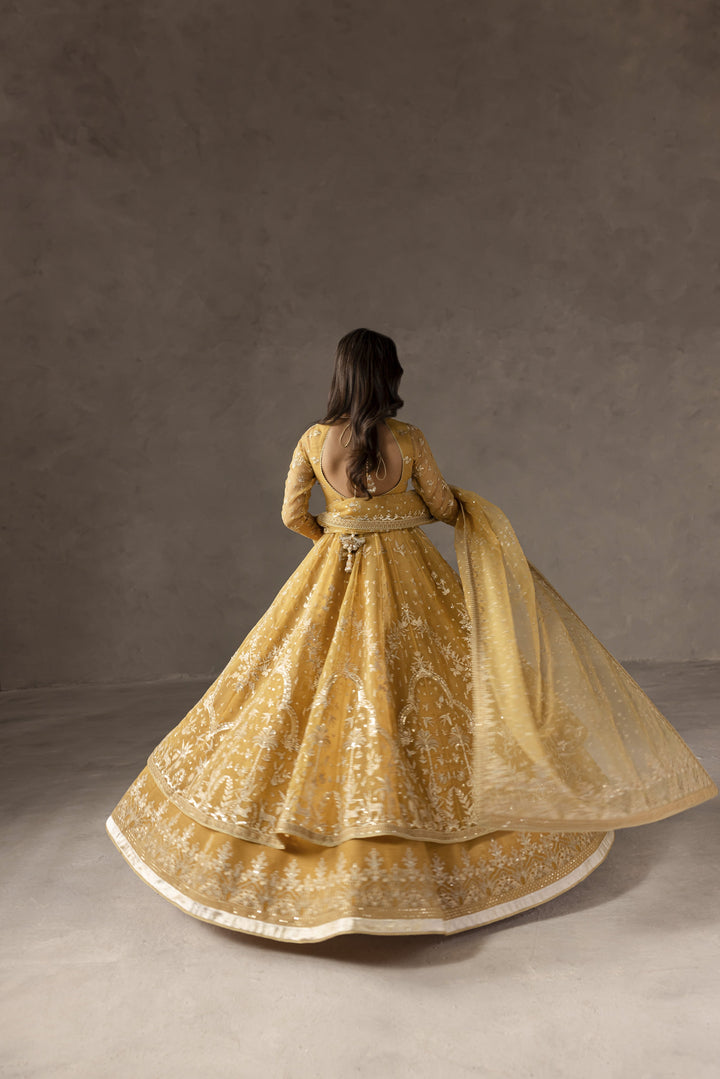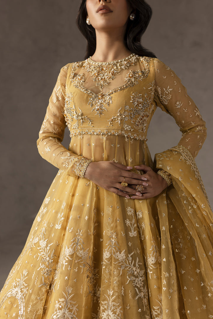 Crafted with precision, this exquisite dress features hand embroidery and embellishments with Kulfi Drops, Bethki, Japanese Cutt Dana, Surahi, Pearls, Crystals, and Pipe Work. Its radiant all-yellow hue exudes elegance, making it perfect for weddings, soirées, and festive occasions. A true statement of luxury and artistry.