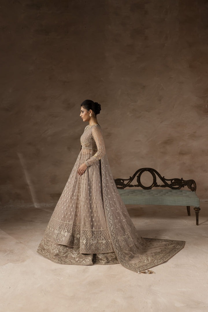 The dress features delicate kulfi motifs, enhanced with cascading drops and intricate surahi patterns that evoke a sense of grace. Shimmering crystals and kashti sitara embroidery add a touch of brilliance, while elegant pearls and stunning bethki accents elevate its charm.