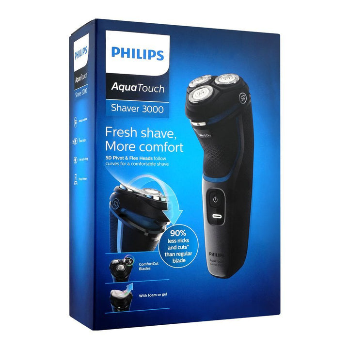 The Philips Shaver 3000 features a 5-directional pivot that meets every angle and curve of your face and neck. This beard shaver cuts each hair right above skin level, to give you a smooth and even finish. Clean your electric shaver with the touch of a button. Simply flip open the shaver head and rinse with water. Use the intuitive indicator to see when the shaver battery is running low, empty, or fully charged. Ergonomically designed for precision and ease, the handle on this wet and dry electric shaver provides extra grip in the shower or at the sink.