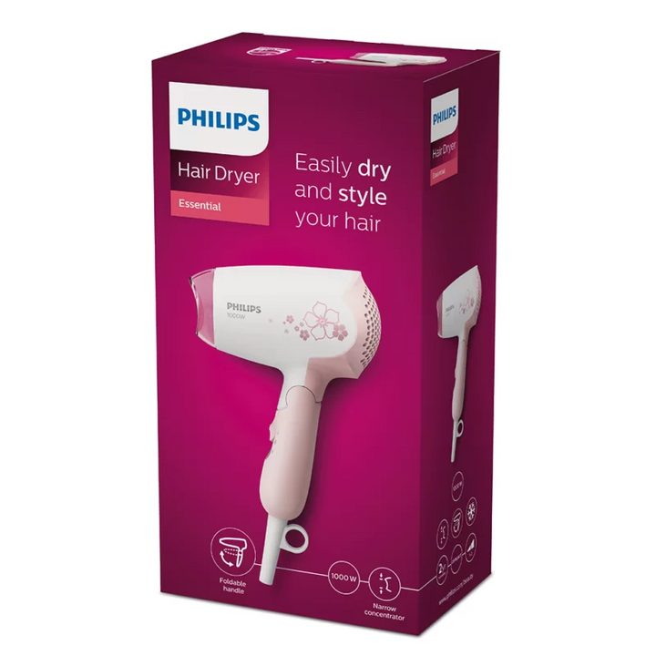 This Philips DryCare 1000W hairdryer creates the optimal level of airflow and gentle drying for beautiful results every day. This hairdryer has a foldable handle, making it easy to pack, store, and take with you anywhere you go. The cool air setting allows you to dry your hair at a more caring temperature, perfect for gentle drying and minimizing damage during the hot summer seasons.