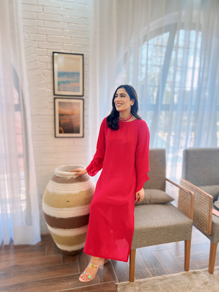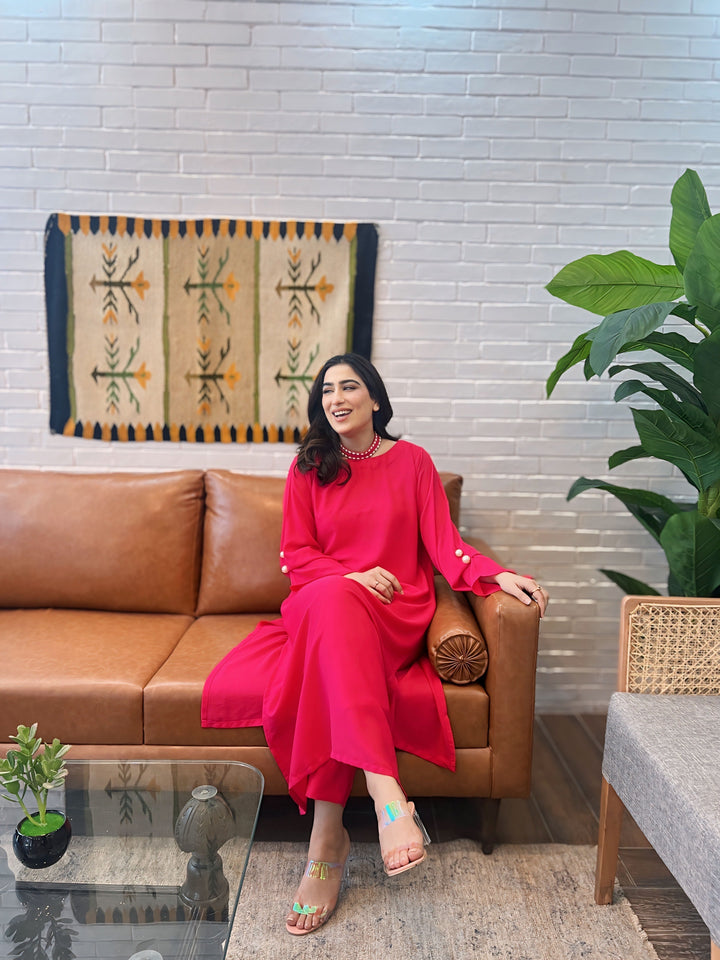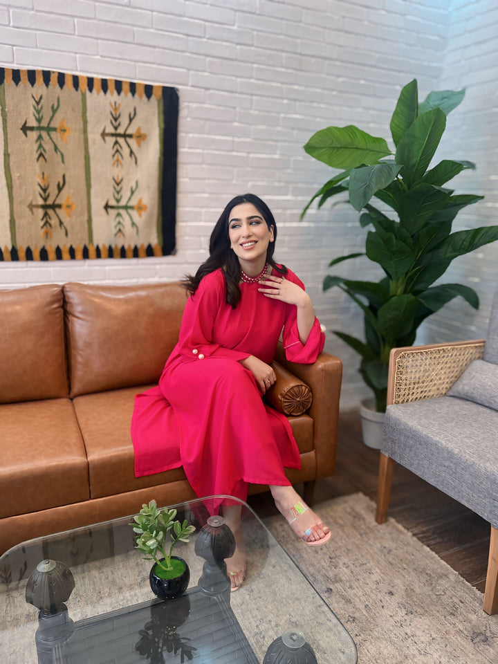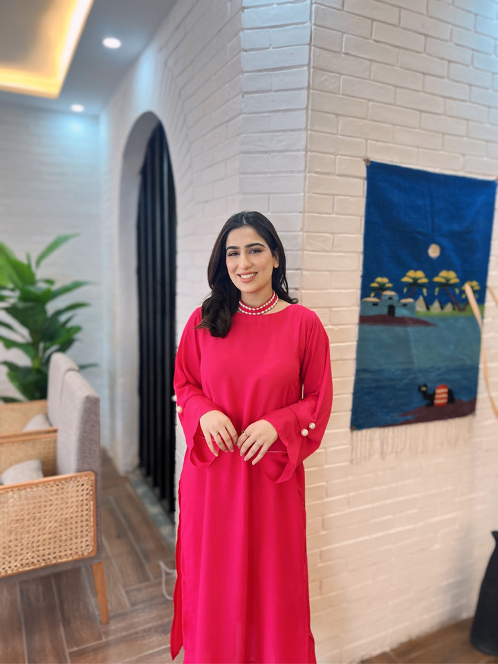 Introducing our pink shirt with embroidered neck a contemporary classic for the modern wardrobe. Immerse yourself in elegance with the unique hanging neck design with pearls on sleeves, adding a touch of sophistication to your style. Crafted from high-quality fabric, this shirt ensures comfort without compromising on style. The rich dark pink color complements various outfits, making it a versatile choice for any occasion. Elevate your fashion statement with this refined piece, showcasing the perfect blend of trend and timeless appeal.