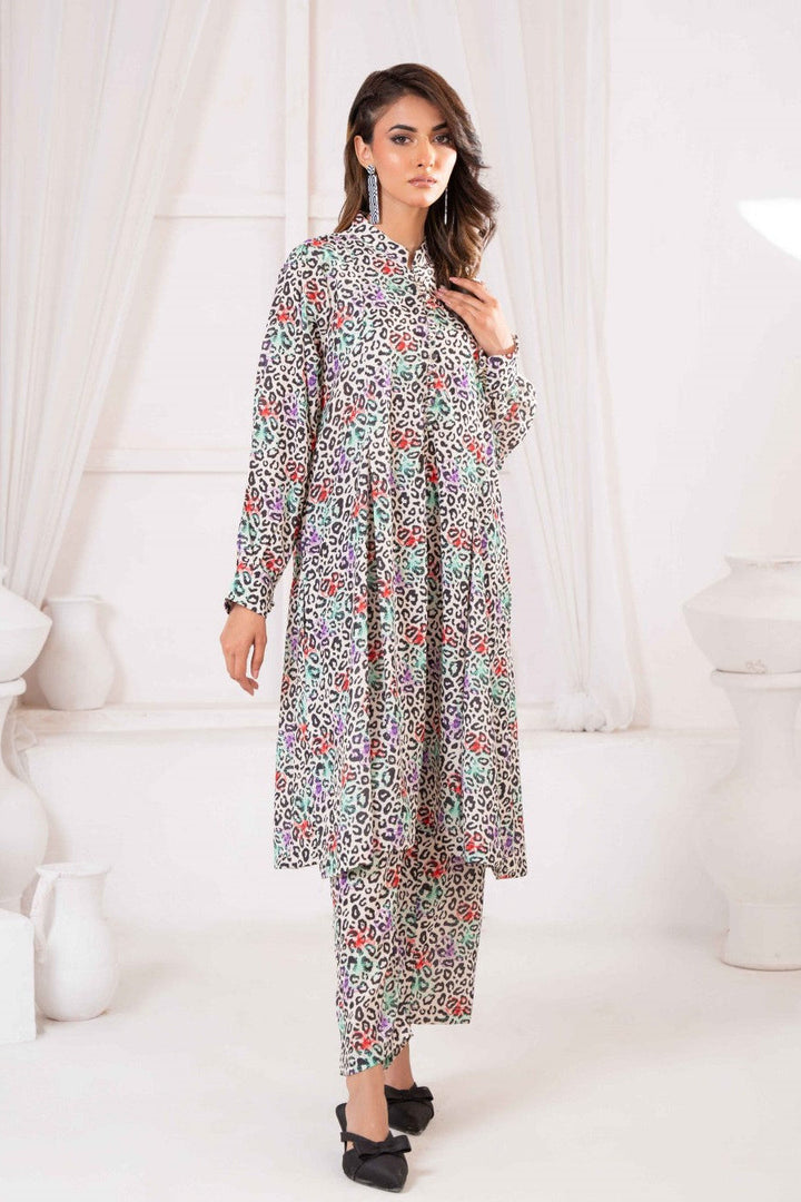 Pop leopard this beautiful article features a two piece co-ord with front pleats on shirt, cuffs on sleeves & a shirt collar with buttons in front, and elegant loose pants.