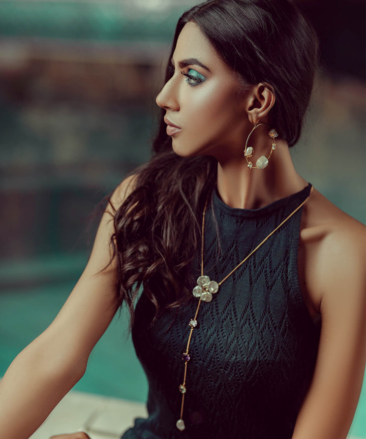 An epitome of elegance topped off with some fun. Porpoise necklace is the answer to 'What to wear today?' Featuring multiple Keshi pearls to create a floral motif along with suspended chain with Golden Topaz, Amethyst and Oval Pearl.