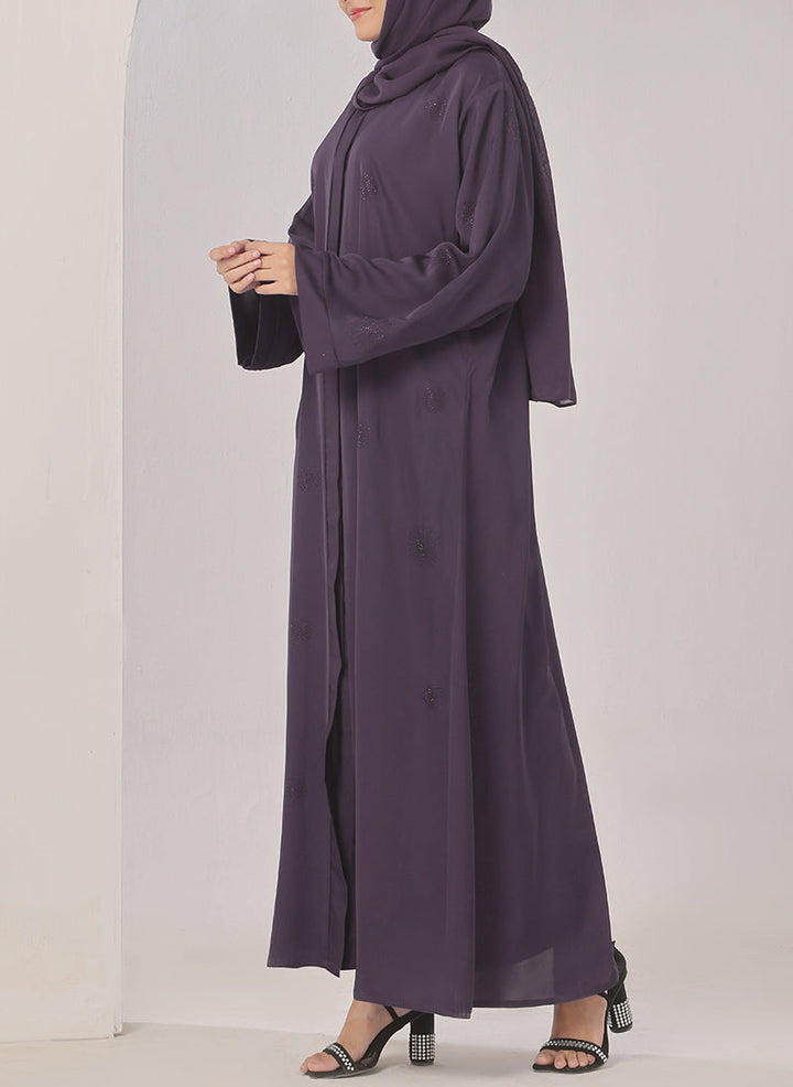 This Purple Abaya is made from soft Nida fabric and features beautiful stone work for an elegant touch. Comfortable and stylish, it?s perfect for both casual and special occasions.