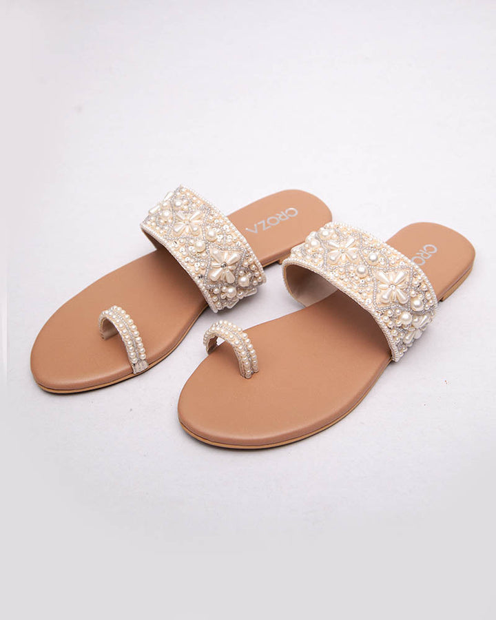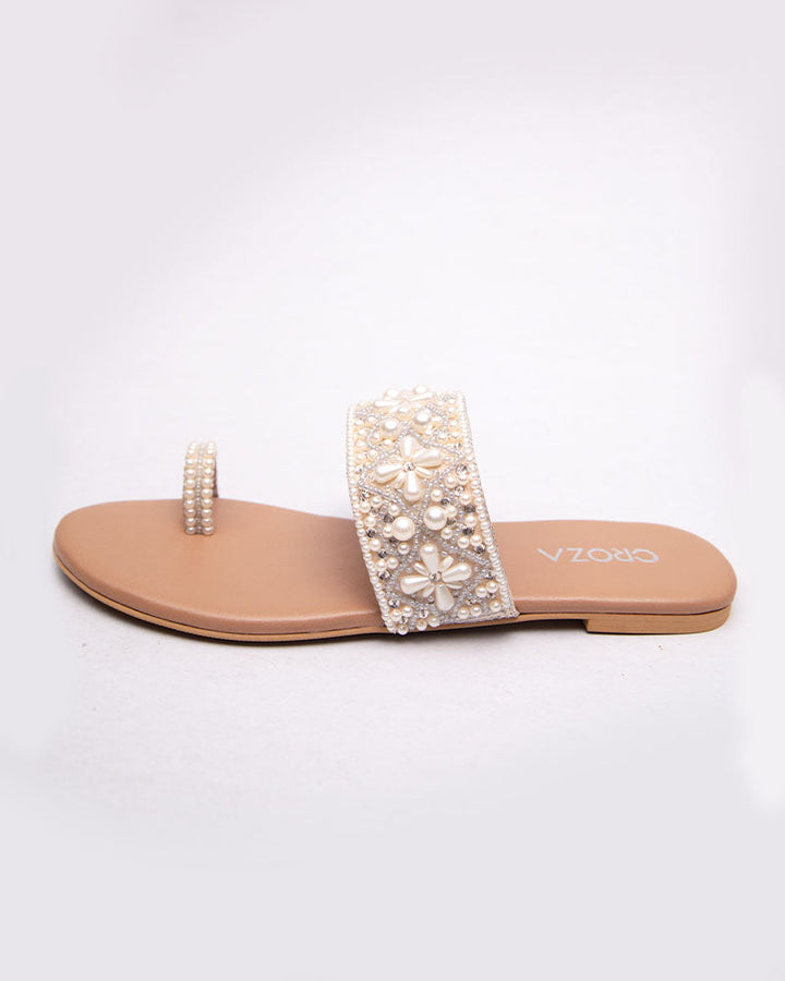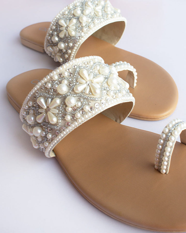 Details: Hand embellished contemporary kohlapuris with off white handwork including swarovskis, pearls and zari. Made on a nude sole to go with all your outfits