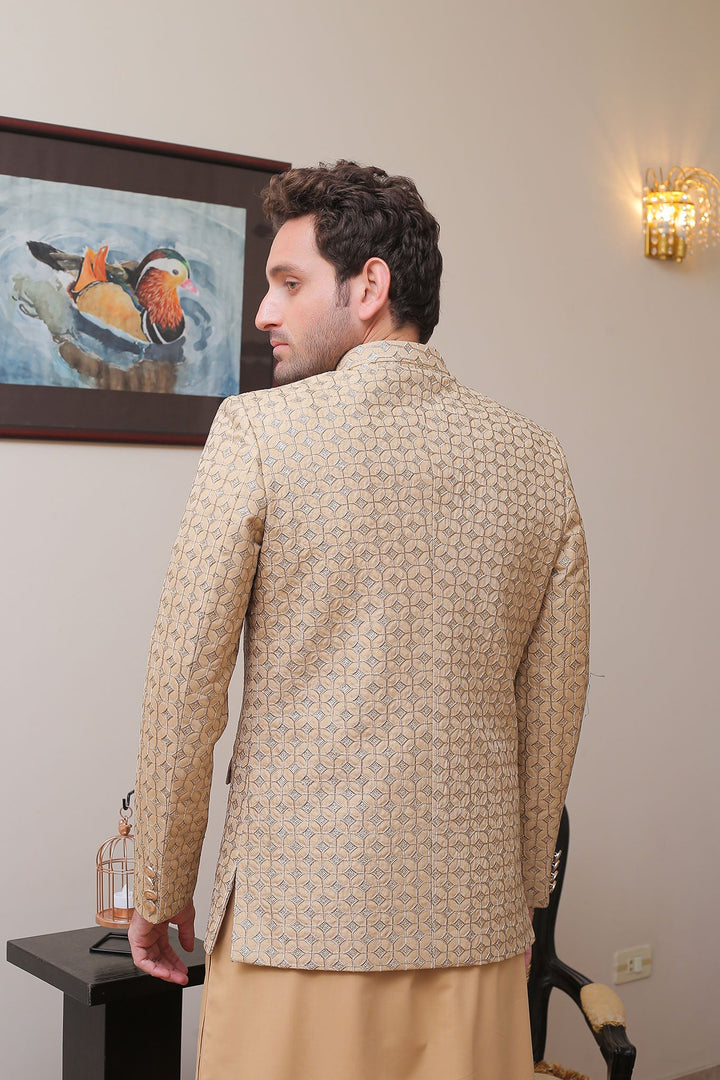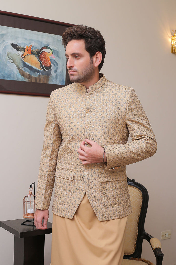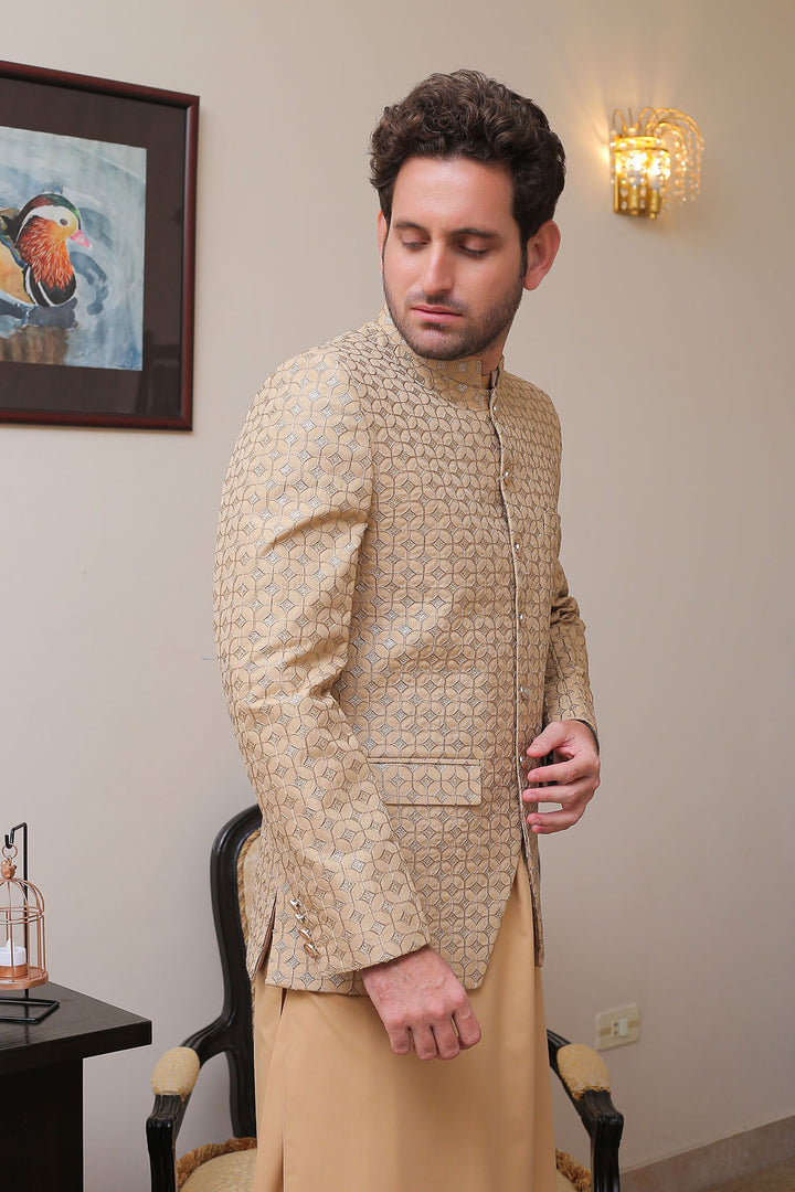 Formal Style Prince Coat for Men , Raw Silk Fabric , With Rich Embriodrey Design in Thread Work and Sequnce in Matt Gold Colour , Special for Festive And Wedding Wear
