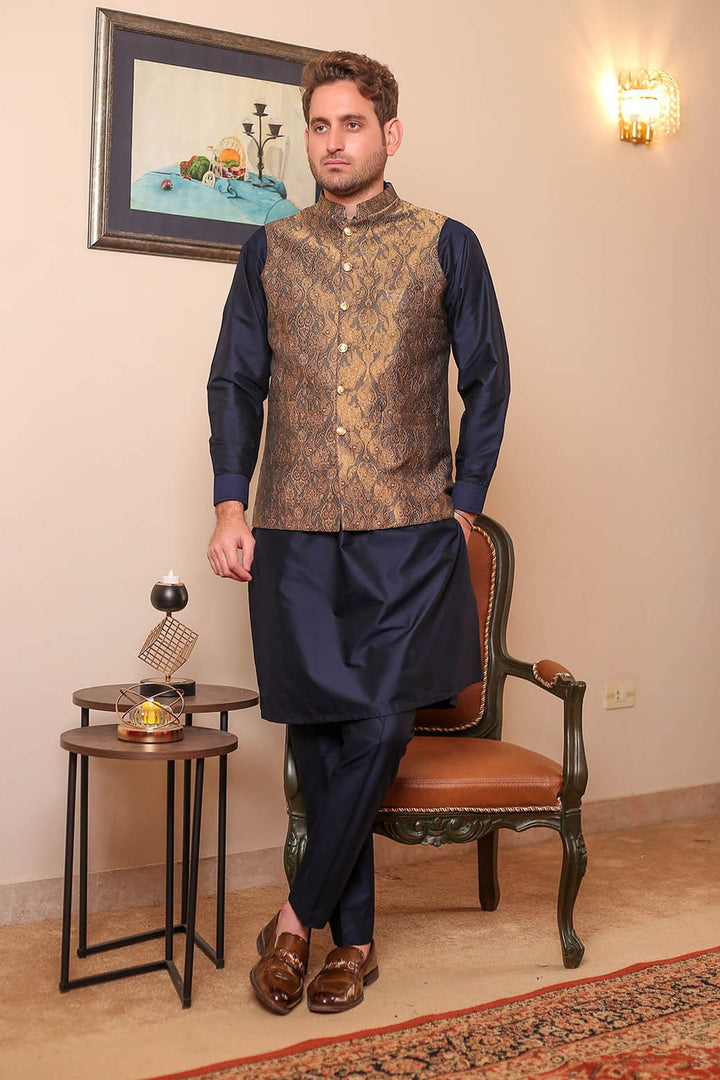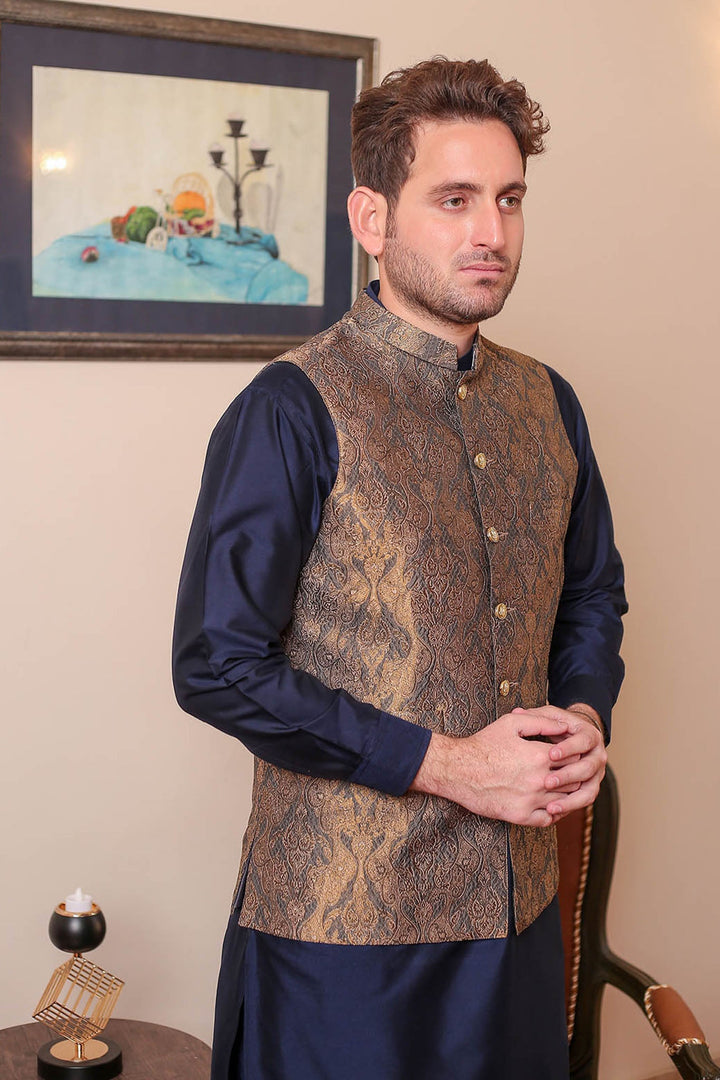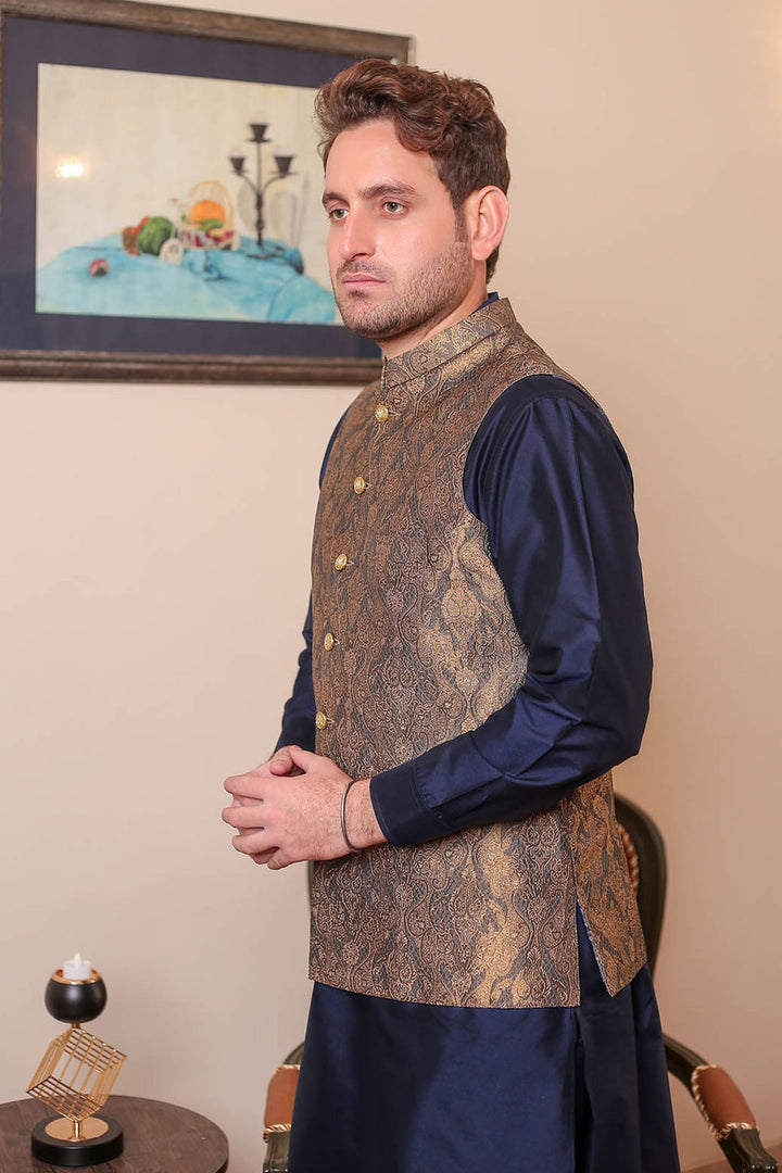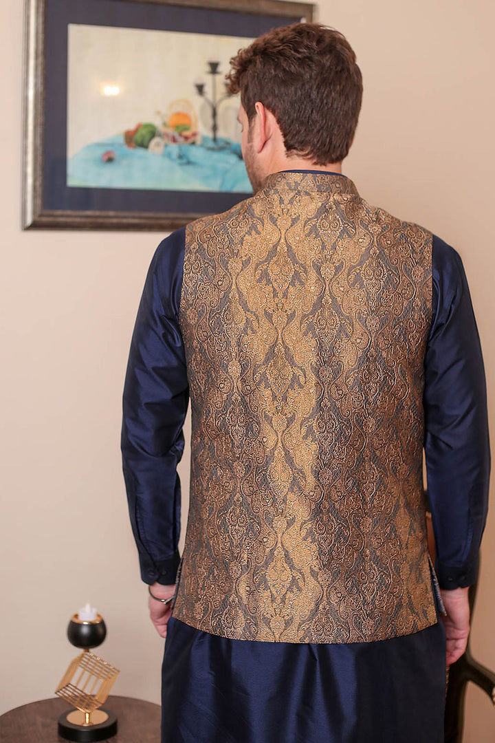 Formal Style Waist Coat for Men , Elegently Designed Jamawar Zari Weaved Fabric With Beautiful Jamawar Design In Grey Brown colour Making it Look Shiny Yet Elegent making it Special For festive and wedding wear