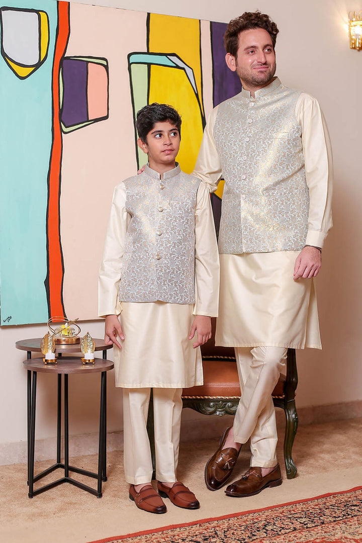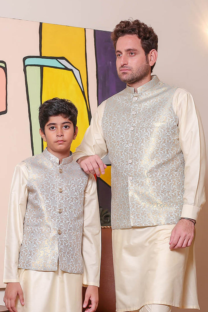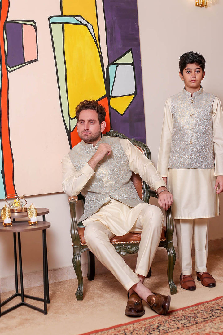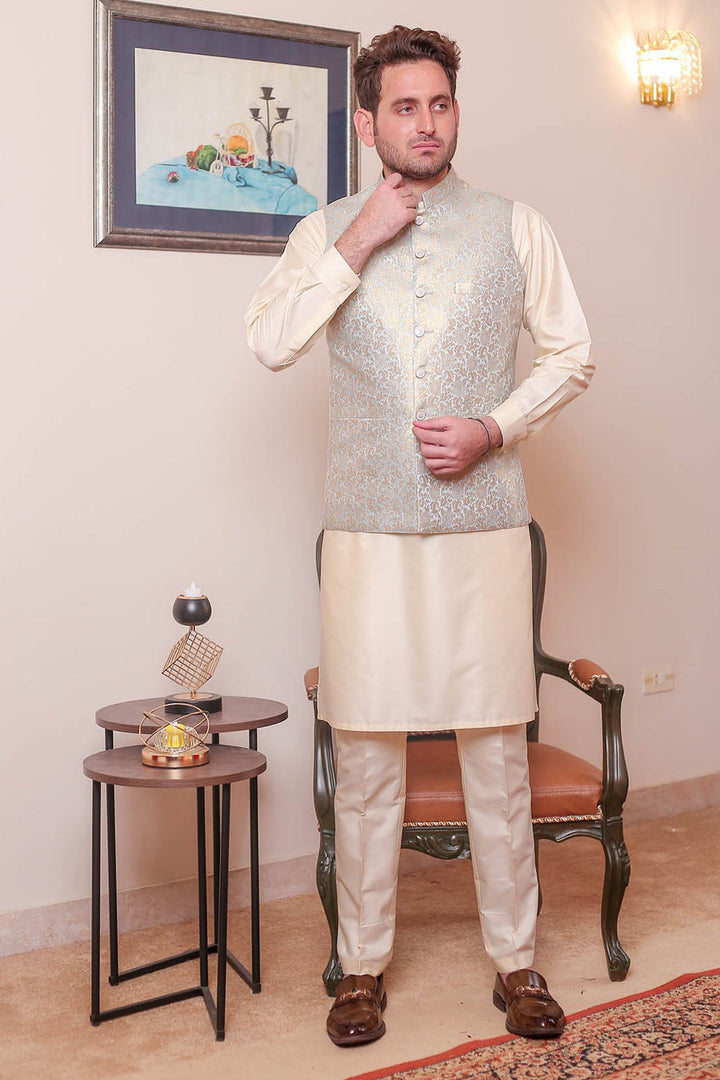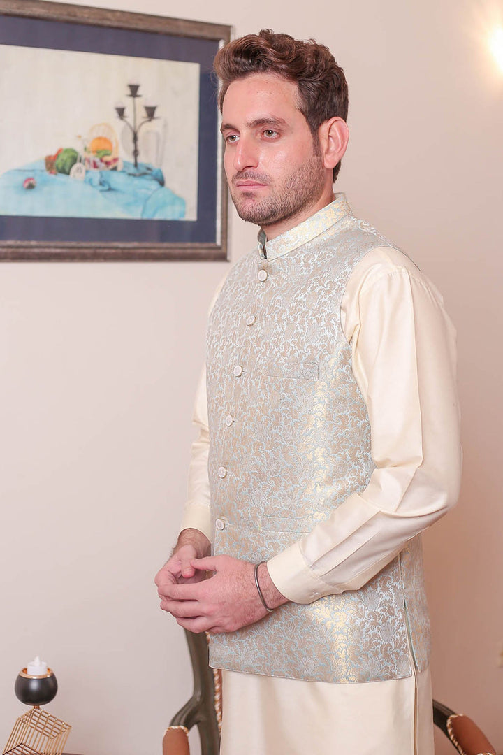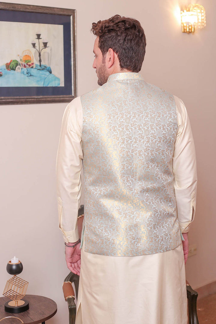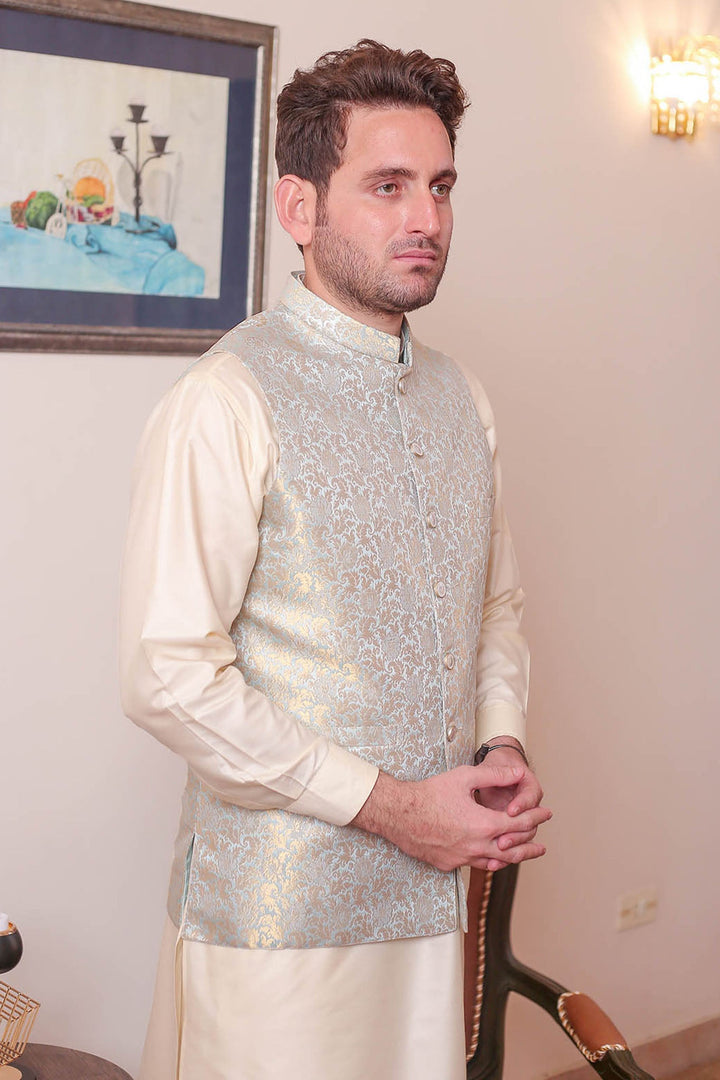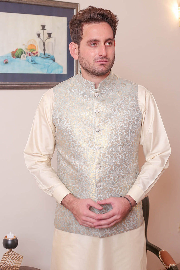 Formal Style Waist Coat for Men , Elegently Designed Jamawar Fabric in Ice Blue Colour with Zari Weaving ,Special For festive and wedding wear