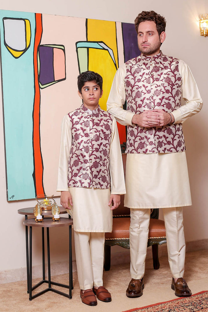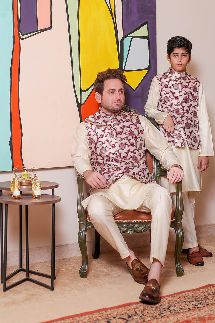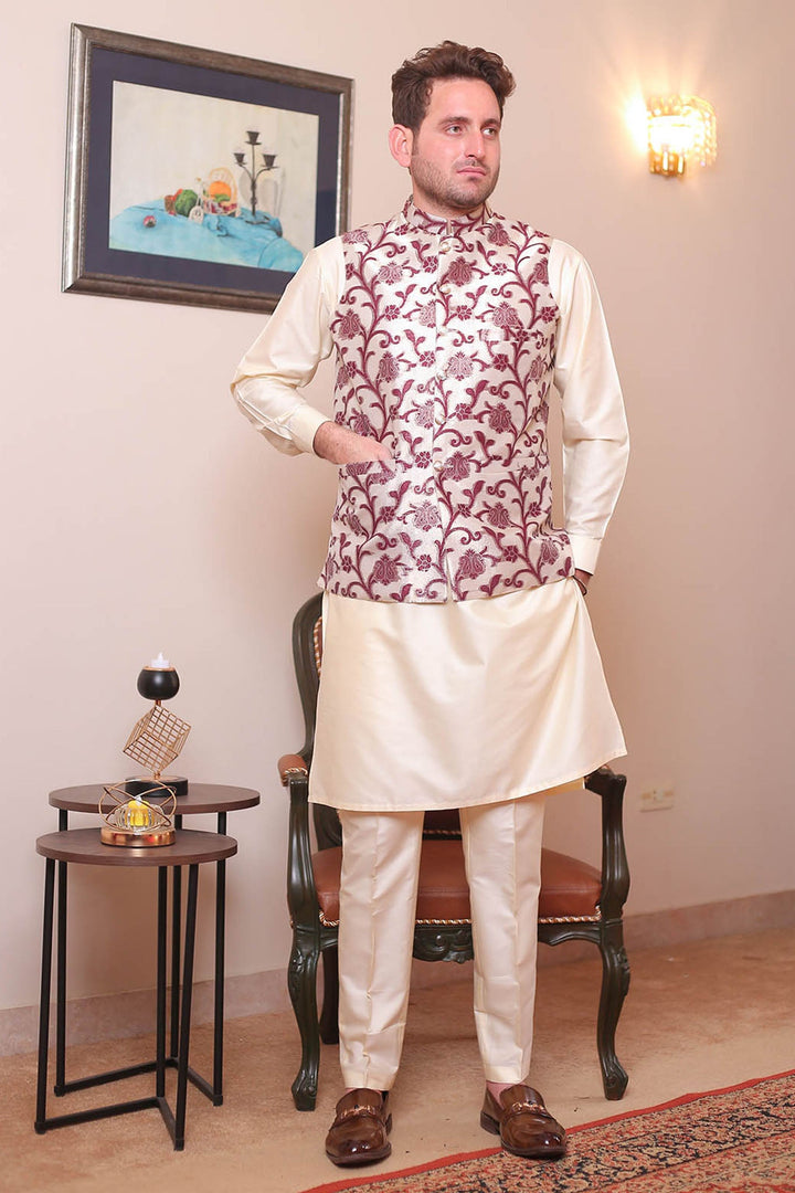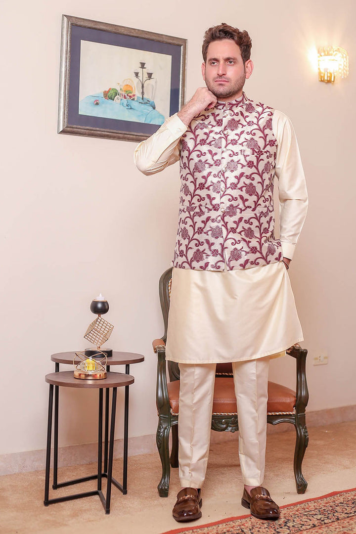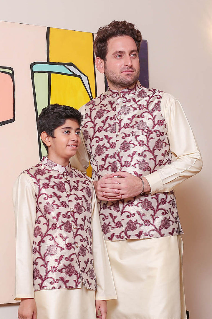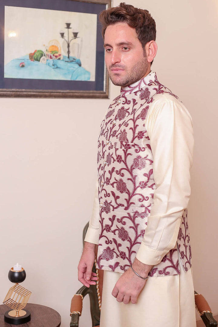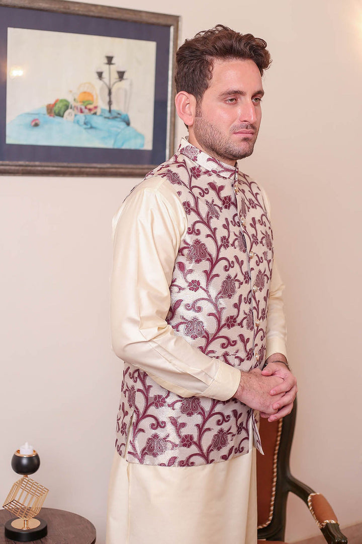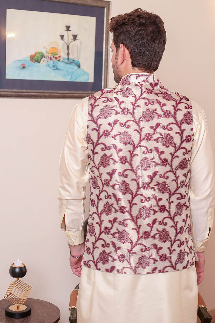 Formal Style Waist Coat for Men , Elegently Designed Jamawar Fabric in Maroon Cream Colour with Zari Weaving ,Special For festive and wedding wear