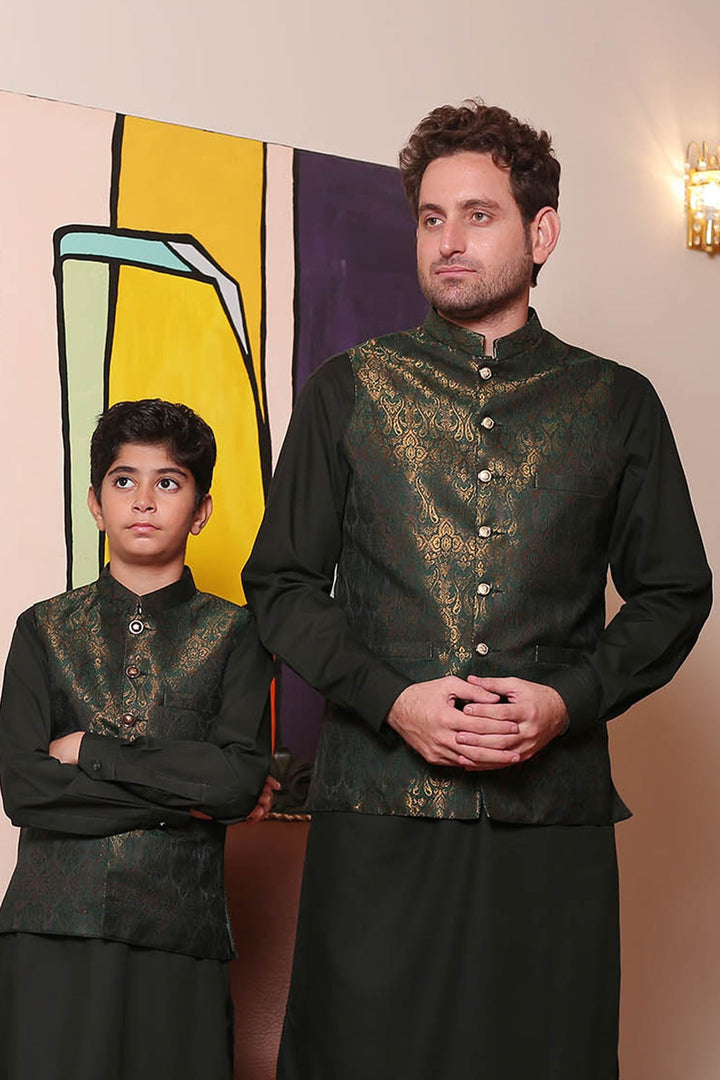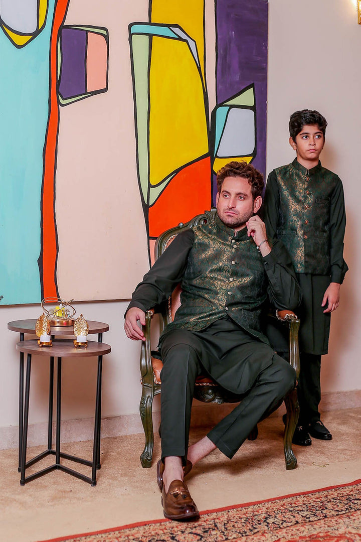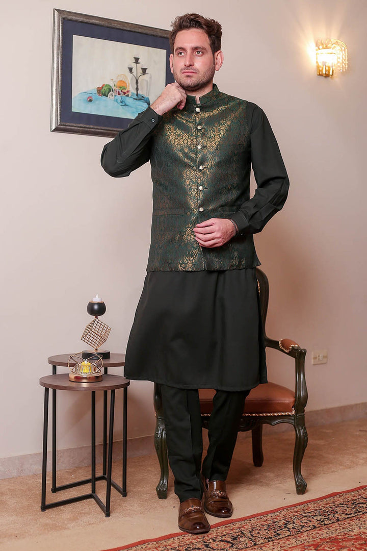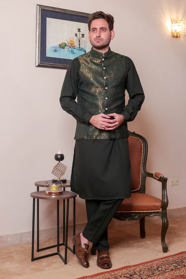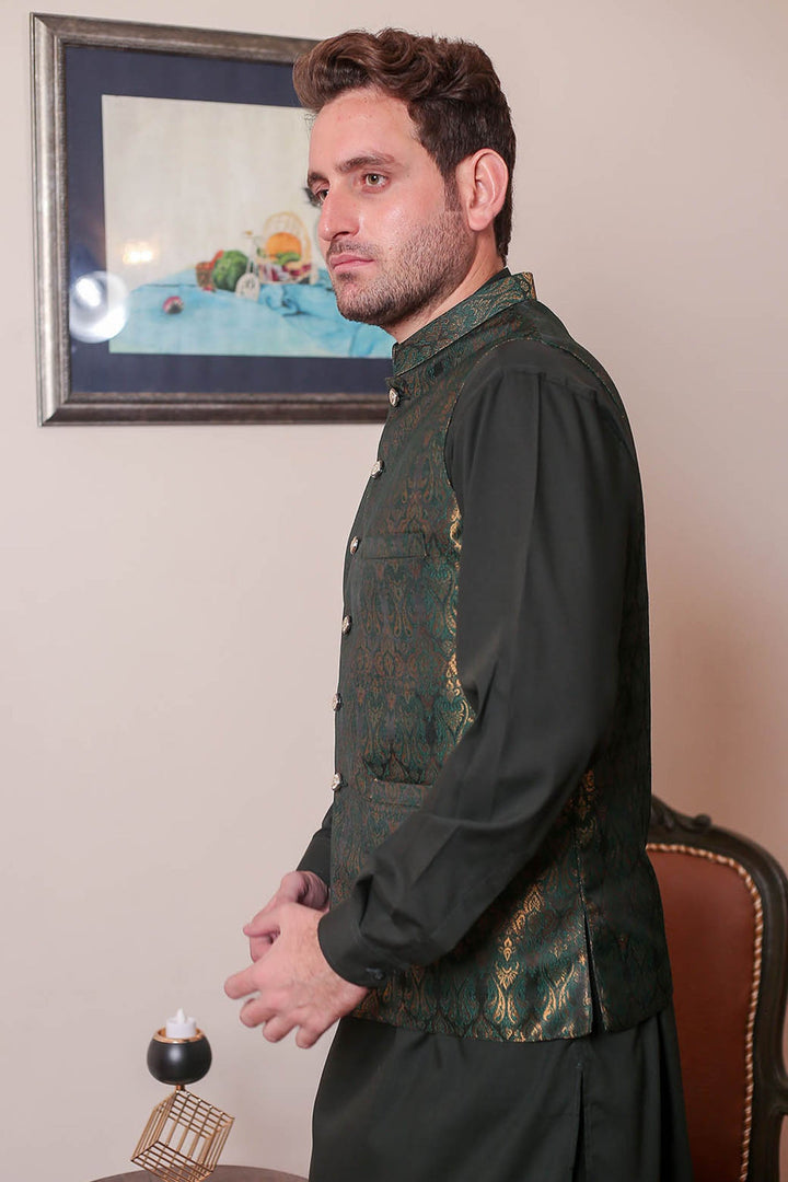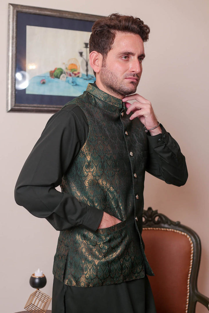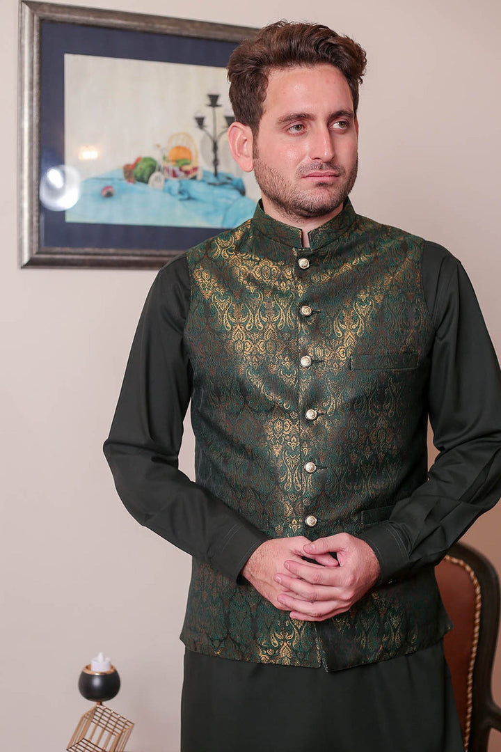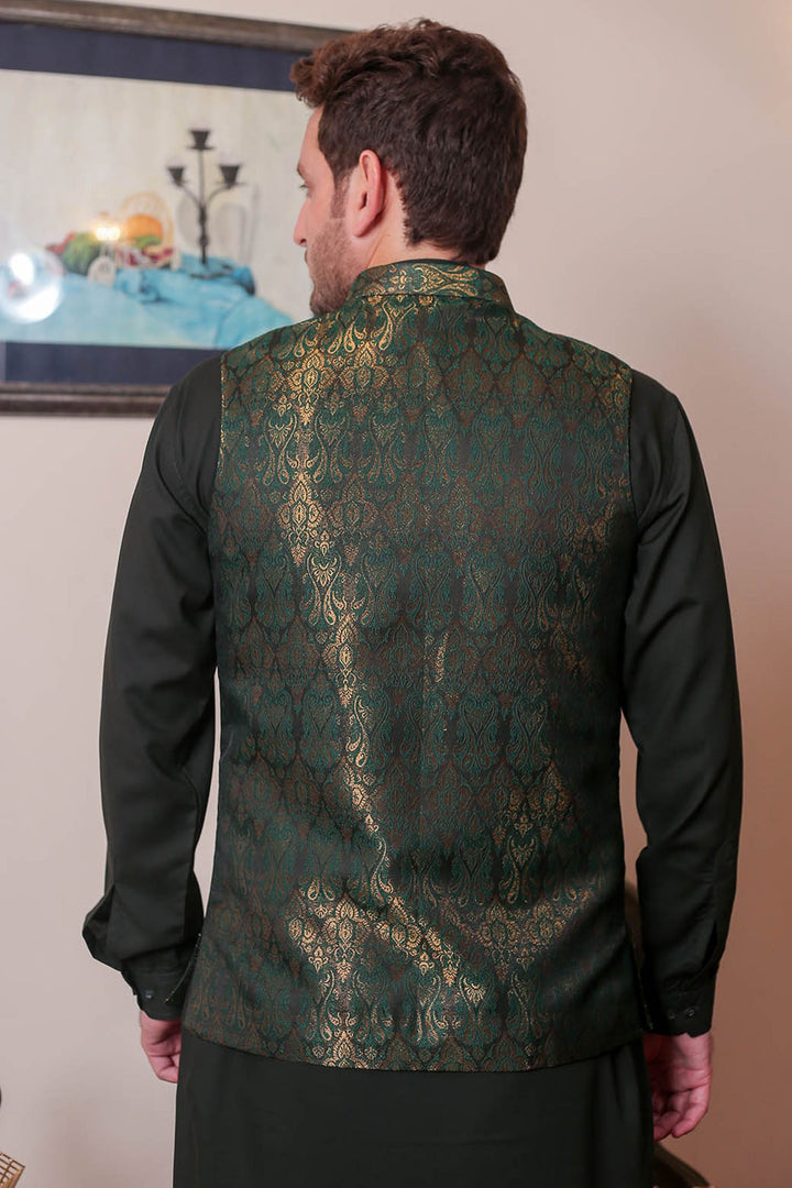 Formal Style Waist Coat for Men , Elegently Designed Jamawar Fabric in Green Colour with Zari Weaving ,Special For festive and wedding wear