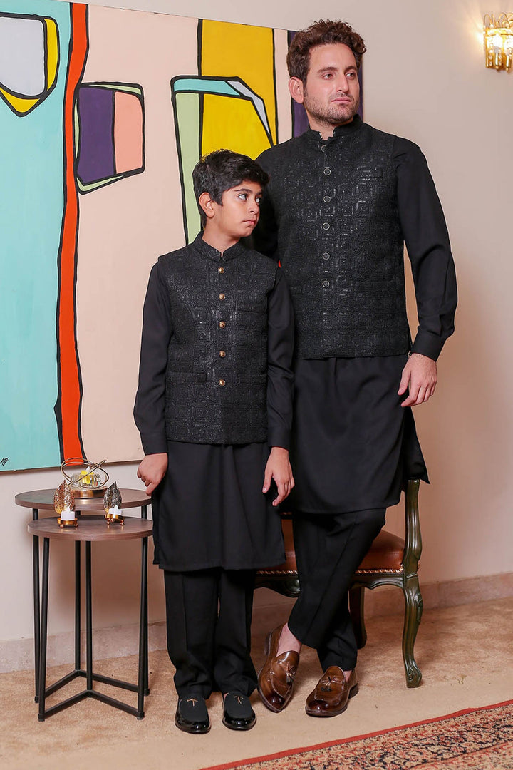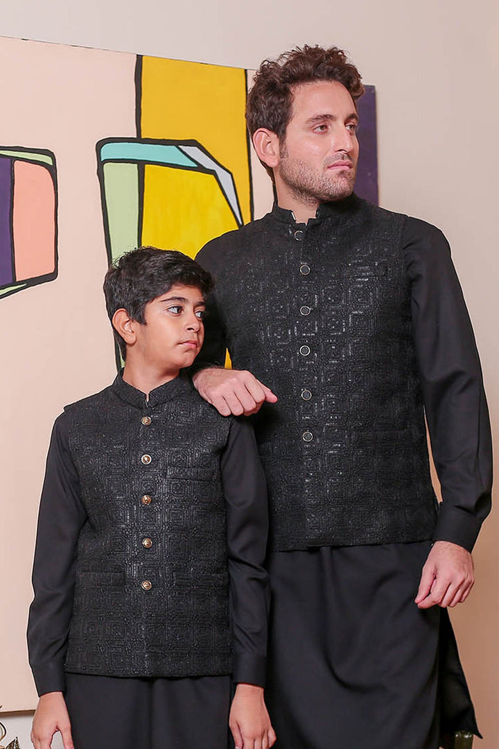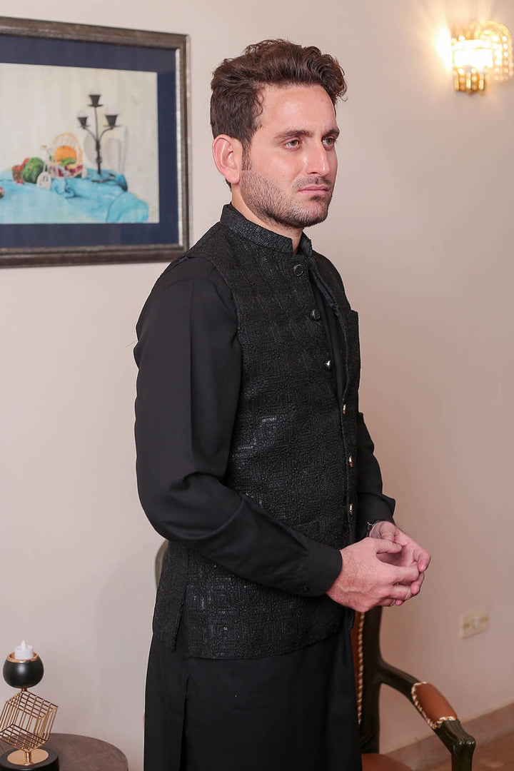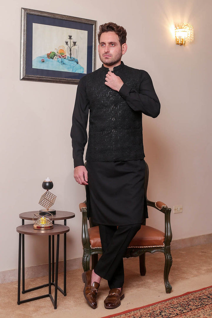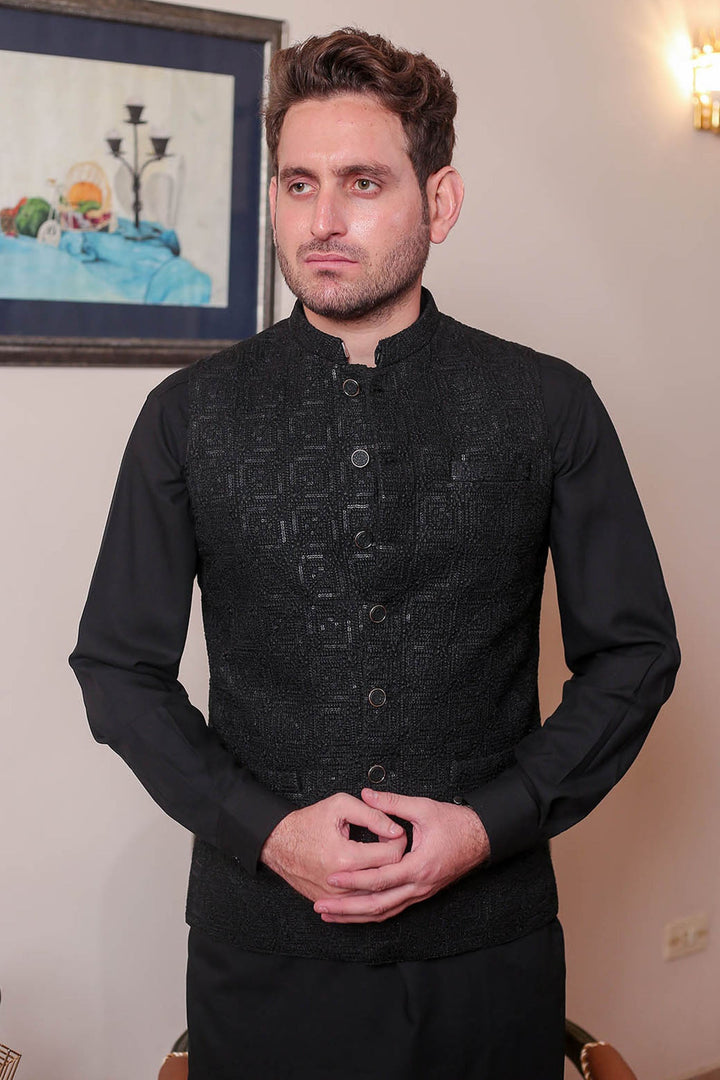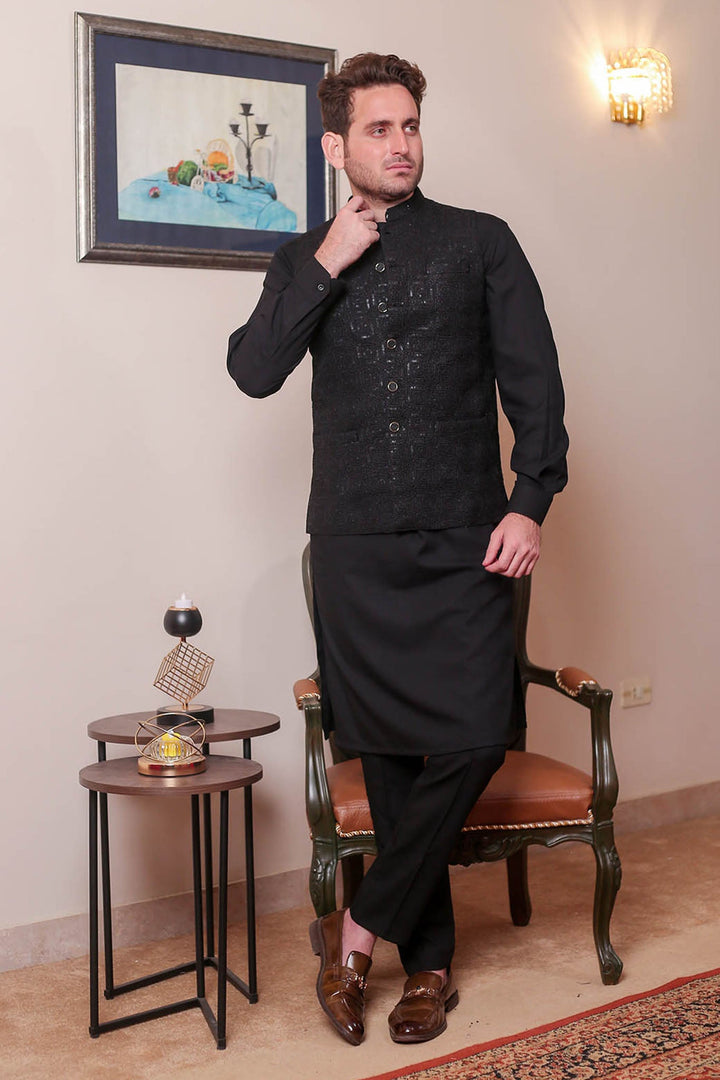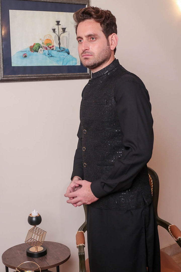 Formal Style Waist Coat for Men , Elegently Designed Jamawar Fabric in Black Colour with Rich Embriodrey ,Special For festive and wedding wear