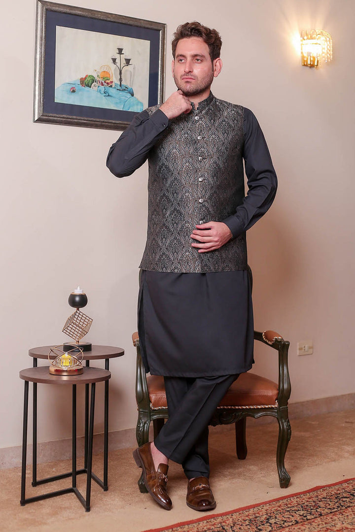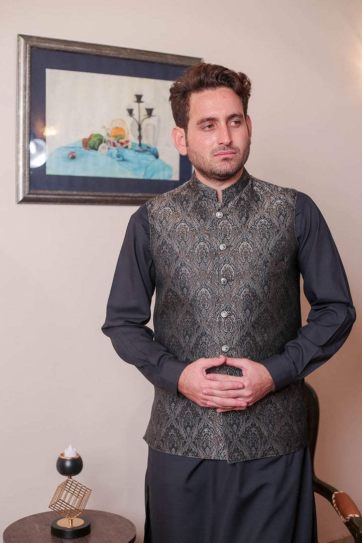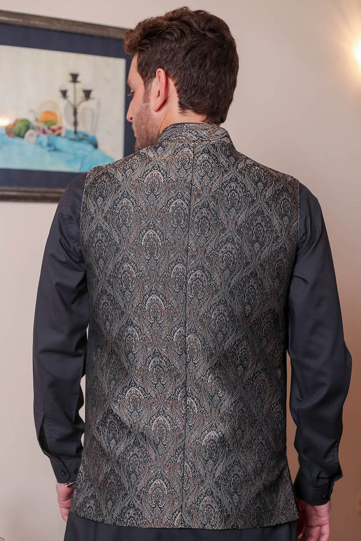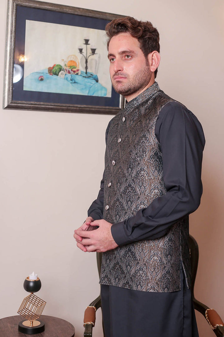 Formal Style Waist Coat for Men , Elegently Designed Jamawar Fabric in Dark Grey Colour with Zari Weaving ,Special For festive and wedding wear