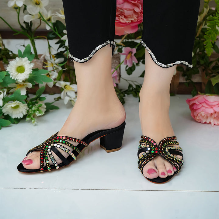 For the timeless and elegant woman, this style will be your closet staple for years to come. Featuring hand-stitched multi-coloured crystals in a scalloped pattern set on a block heel for extra comfort.
