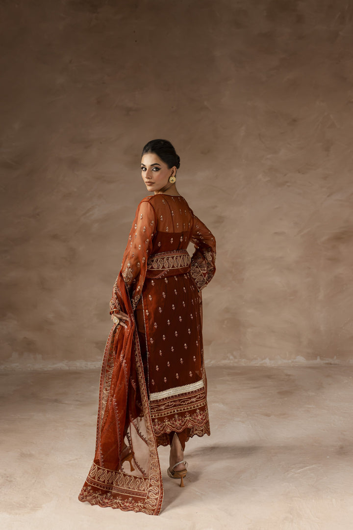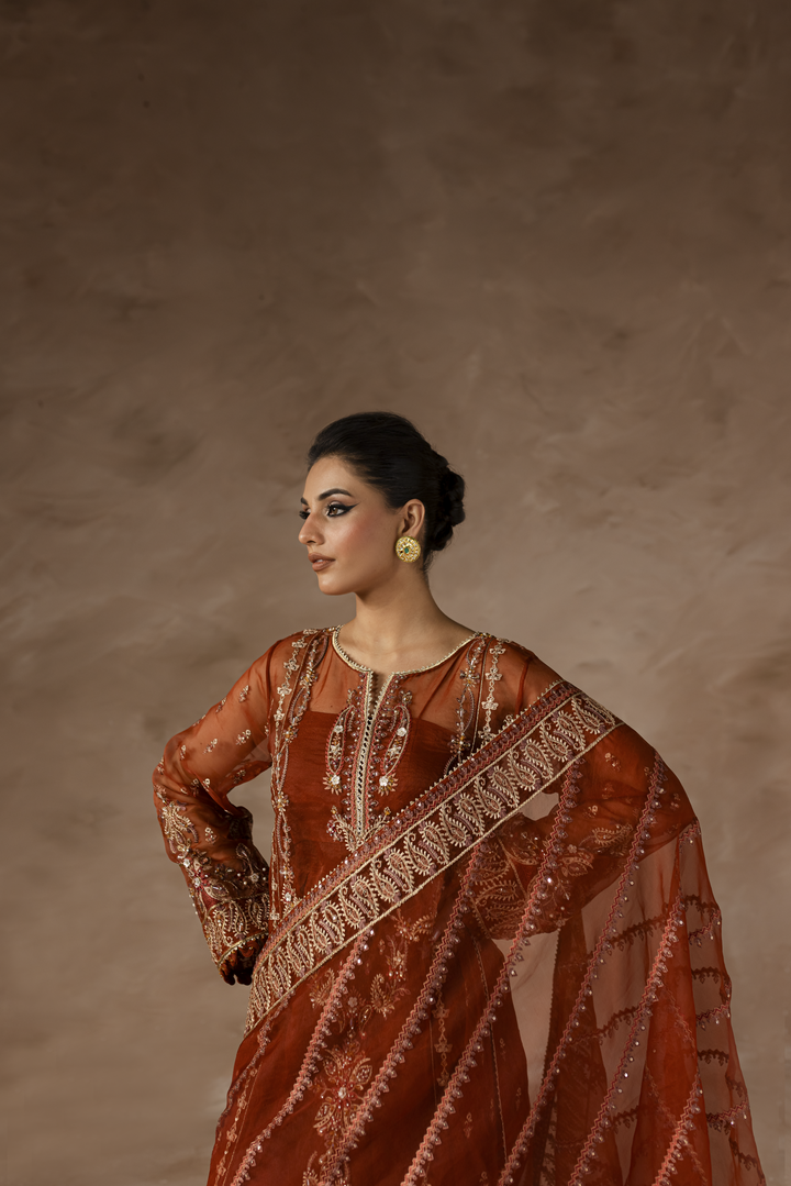 Radiating refined luxury, this rust-red ensemble features an ethereal organza shirt and dupatta, paired with elegantly tailored raw silk trousers. Intricately hand-embellished with Kulfi Drops, Pipe Work, Crystals, Pearls, Bethki, Japanese Cutt Dana, Telenor Sitara, and Cup Sitara, it exudes a mesmerizing shimmer and sophistication. A perfect choice for weddings and festive occasions, where tradition meets classic glamour.
