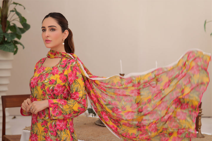 The article includes:Unstitched 3PCDigital Printed Shirt 3 yardsDigital Printed Chiffon Dupatta Digital Printed Trouser 2.5 yards
