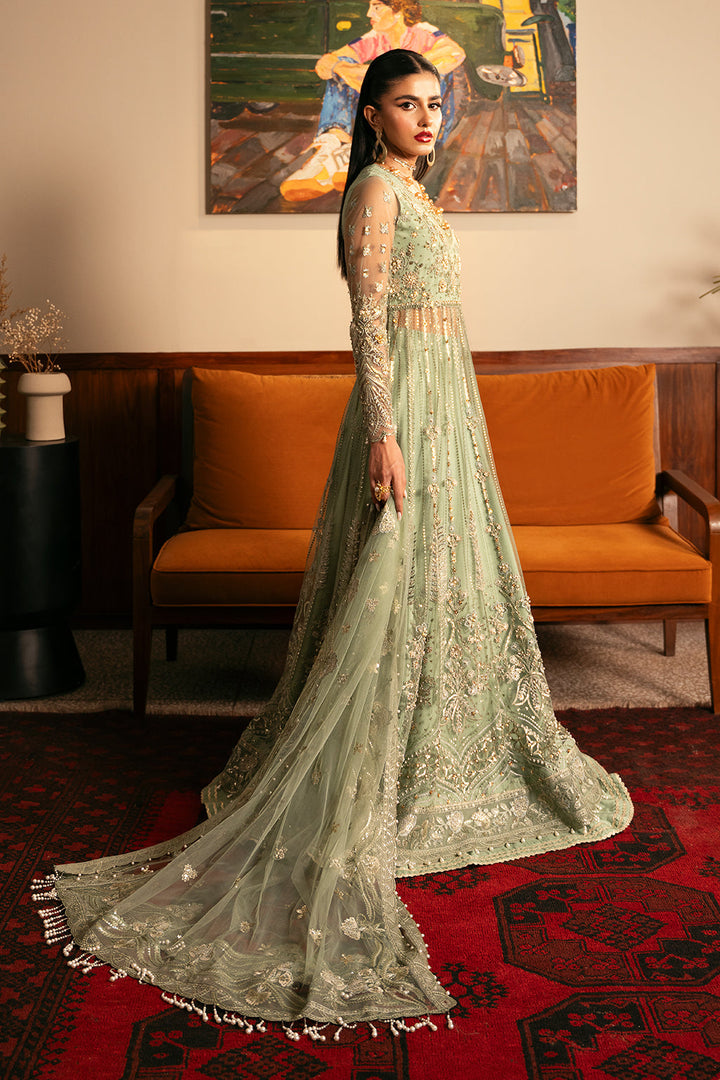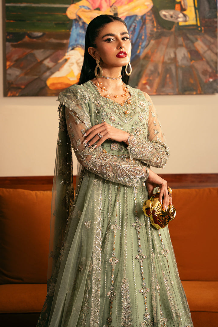 A graceful sage green maxi crafted with meticulous attention to detail, featuring stunning hand embellishments on the front bodice and flowing kalis. The design radiates elegance and charm, while the accompanying sequin-encrusted dupatta adds a touch of sparkle and sophistication. Perfect for formal occasions and festive events, this ensemble combines timeless beauty with contemporary allure.