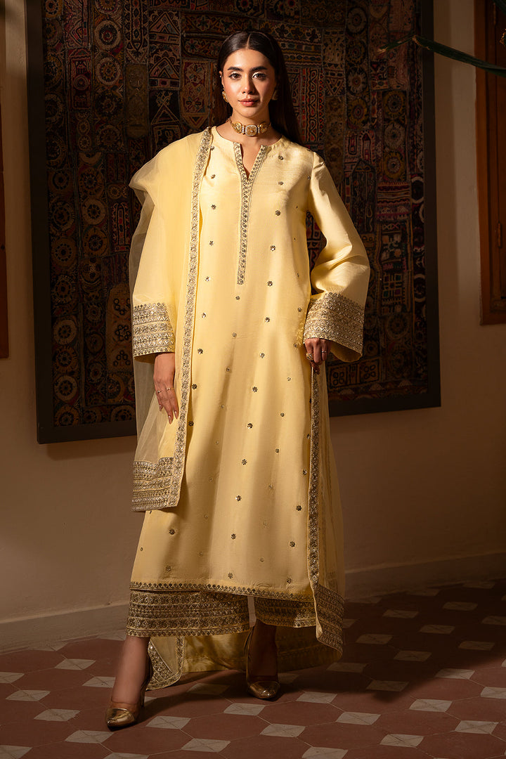 The yellow tassel silk shirt features a delicate sequin embroidered spray across the fabric, while the finely crafted borders add a touch of opulence. Paired with matching yellow tassel silk trousers, adorned with a sequin spray and embroidered sequin borders, the outfit creates a flawless harmony of texture and detail. The ensemble is completed with a graceful organza dupatta, featuring sequin-embroidered pallu borders that elevate the entire look. Perfect for festive occasions, weddings, or evening soirees, this ensemble radiates both warmth and sophistication.
