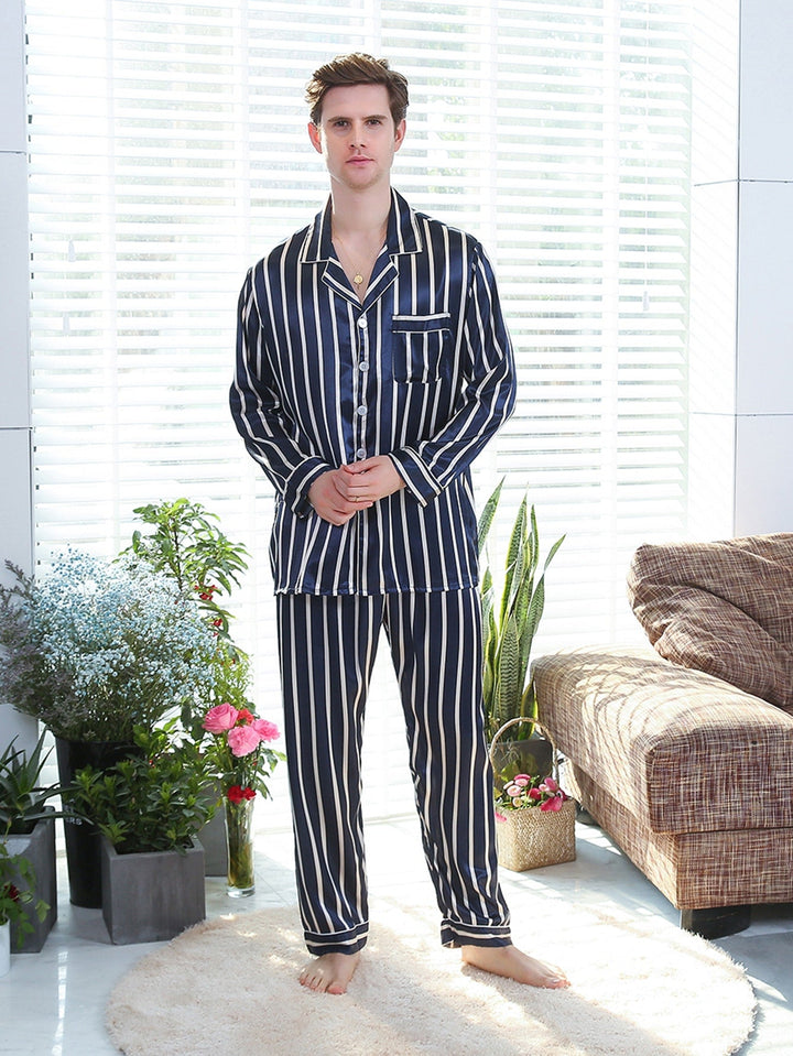 Sebastian Men's Silky Satin Navy Strip pajama set pjs, satin, full sleeve