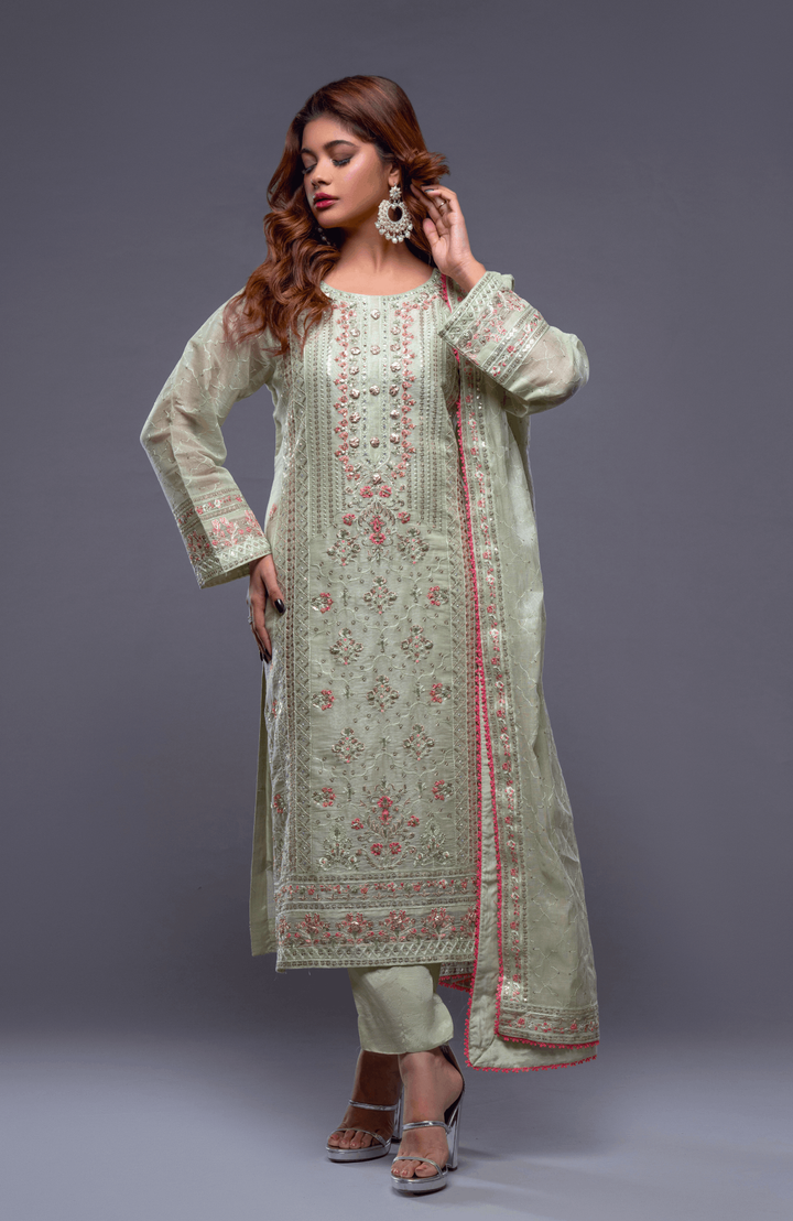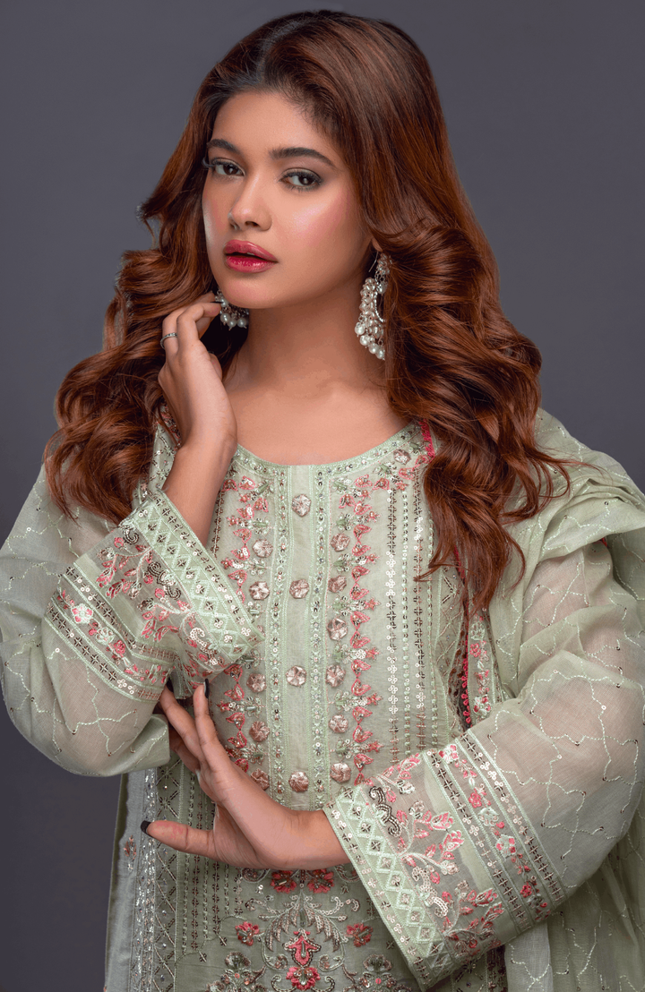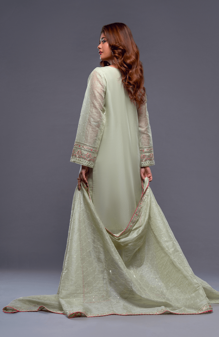 Sparkle your way through the crowd in this delicate and radiant ensemble, featuring head to toe resham and sequin-work on shirt and dupatta.