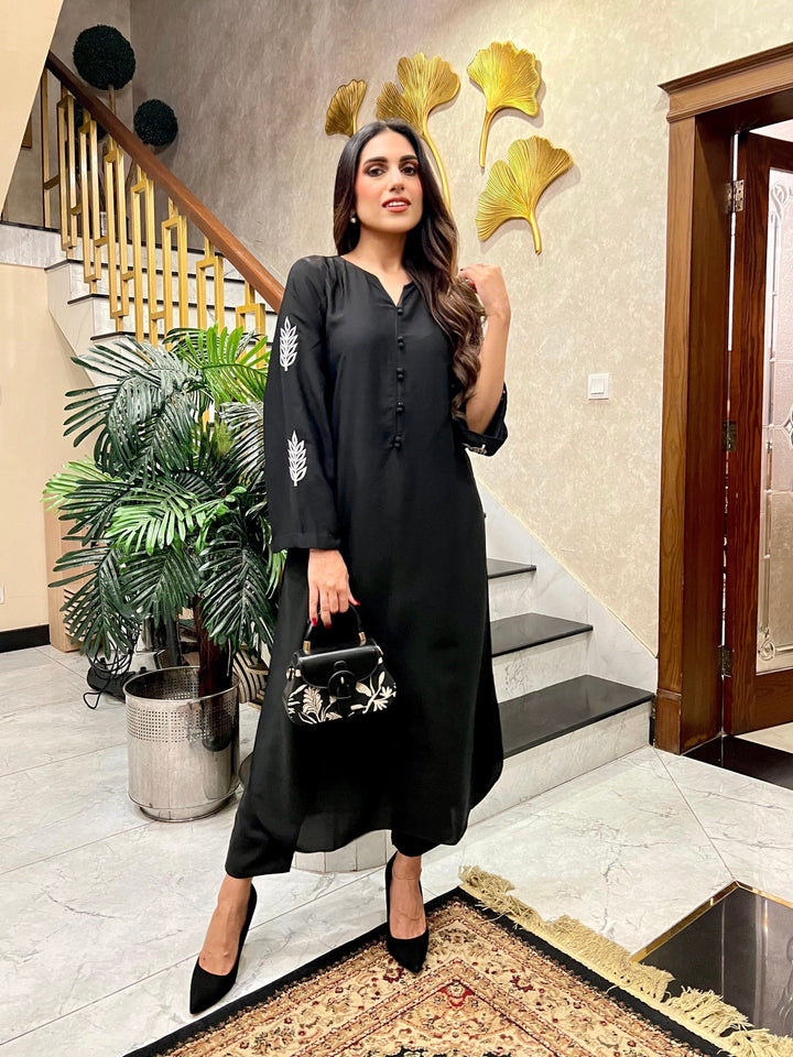 Manahils By ALLECHANT Introducing 'black embroidery shirt a shirt that blends comfort with style seamlessly. Crafted from premium crepe fabric, its unique pattren design with white embroidery a touch of bohemian flair to your wardrobe. Versatile and effortlessly chic, 'Embroidery' embodies the essence of semi formal sophistication, making it a must-have for those who appreciate fashion with a free-spirited edge.'
