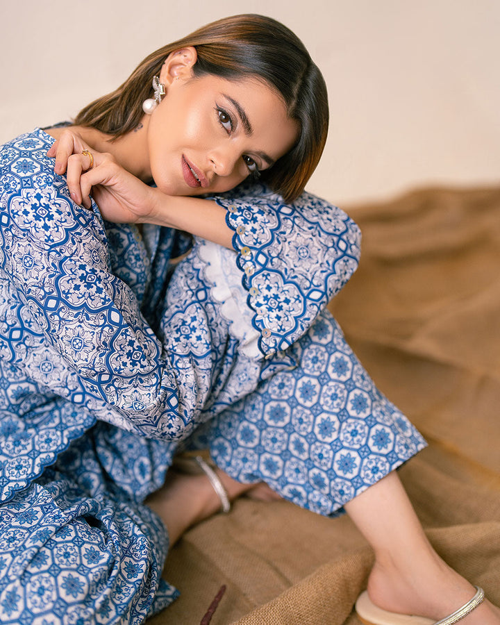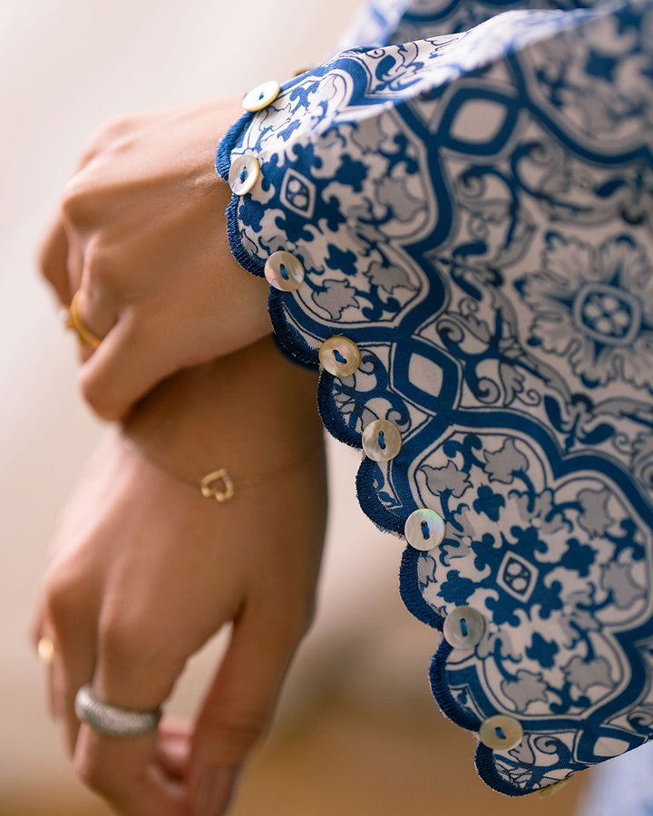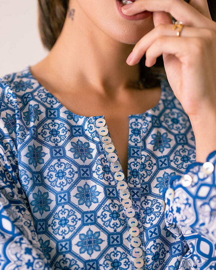 Discover the charm of this Eastern garment, featuring a print inspired by intricate Spanish tile patterns. The design showcases a captivating mosaic of vibrant patterns with Hues of blues, echoing the timeless beauty of classic tilework.
