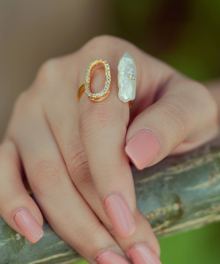 Made with real Biwa Pearl encasing Zircon Crystal and Zircon loop on the other side, together they give a flair of luxury to this beautiful ring.