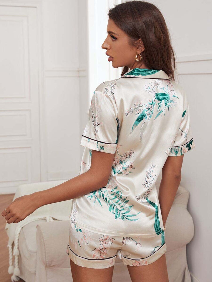 • Floral Print Contrast Piping Pocket Front Satin Short Set Women Night wear