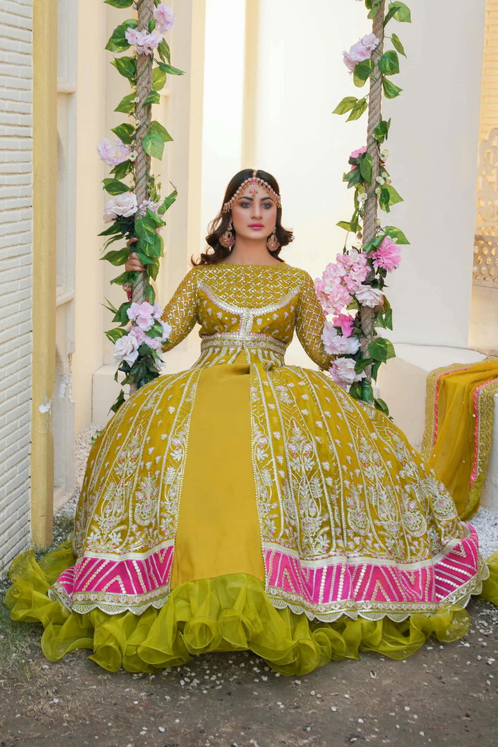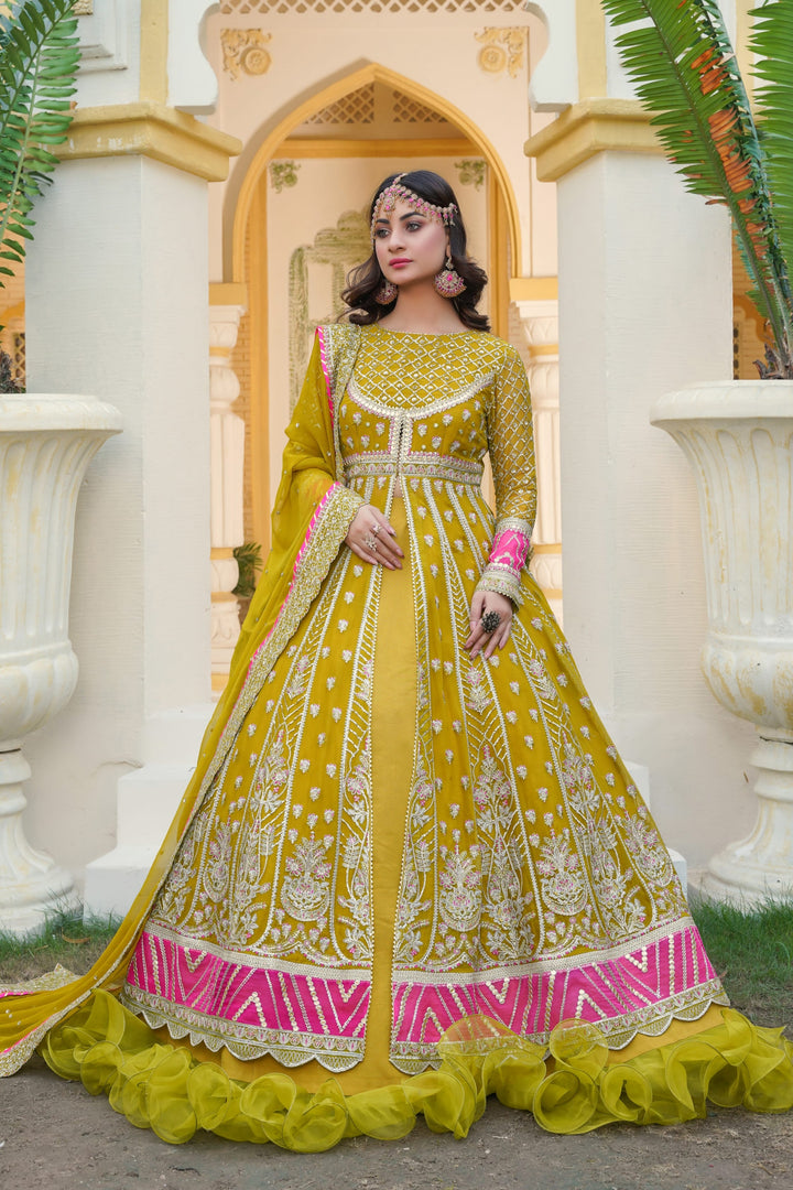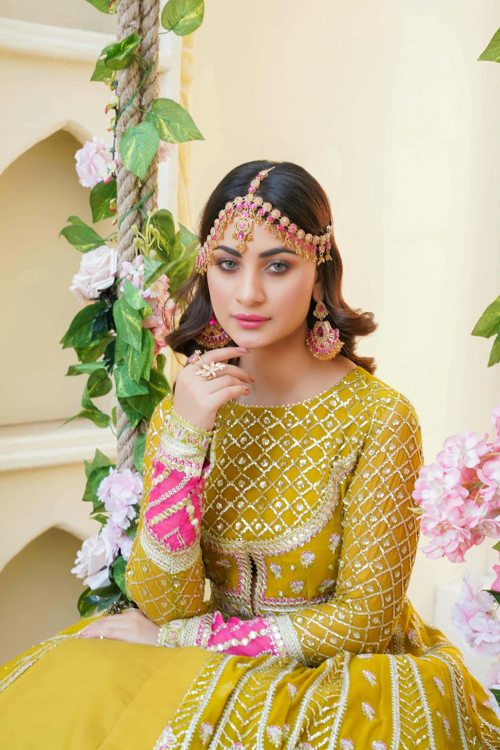 This exquisite 3-piece unstitched pishwas is made from luxurious chiffon fabric, featuring heavily embroidered front and back panels adorned with intricate threadwork, gold tila, sequins, and panni details. The ensemble is complemented by a contrasting raw silk inner for added richness and comfort. Additionally, heavily embroidered patchwork enhances the overall elegance, making it a perfect choice for special occasions with its blend of traditional and contemporary charm.