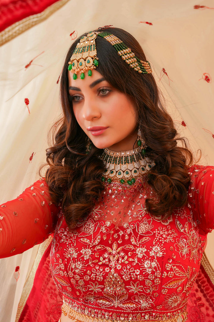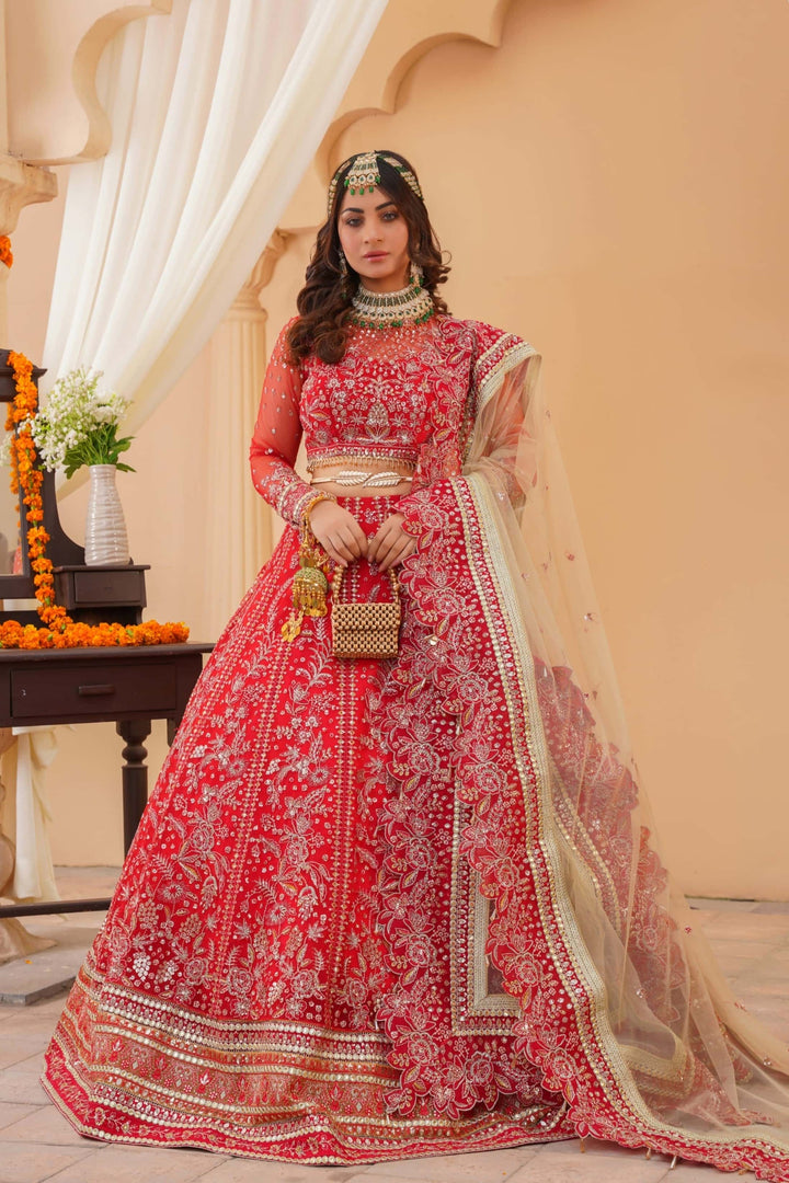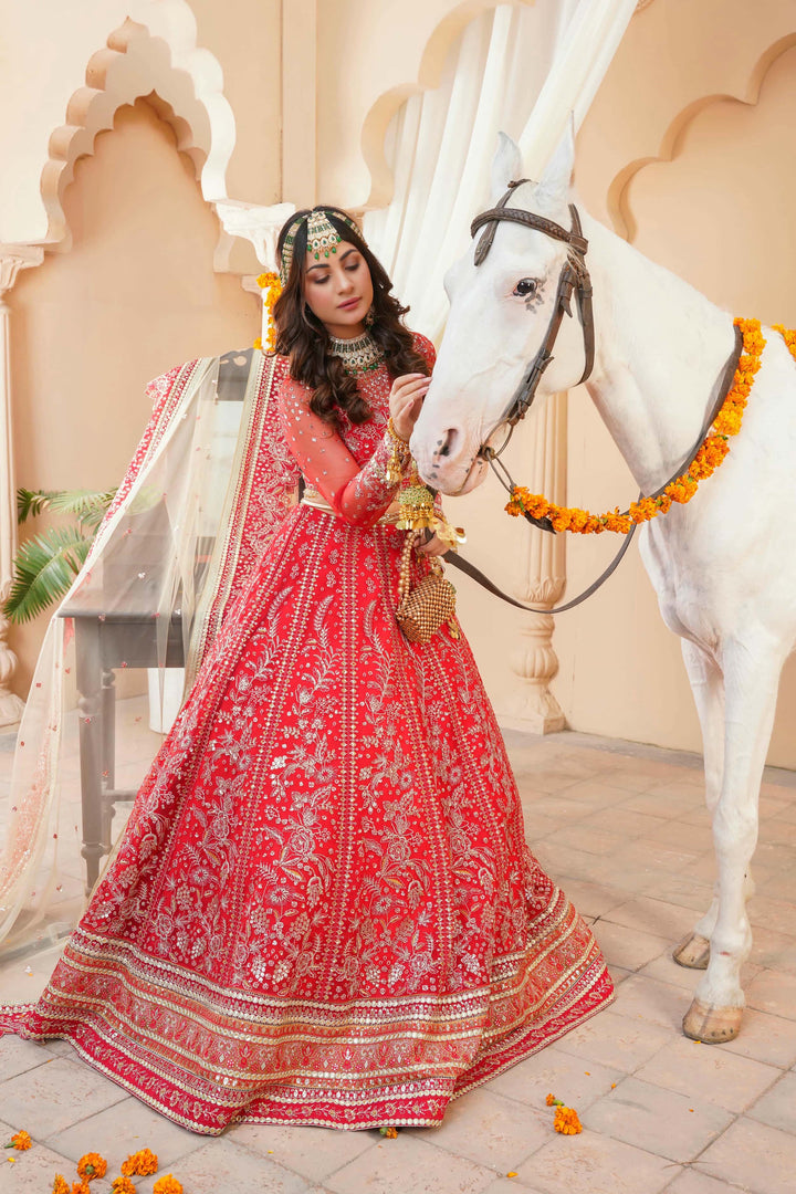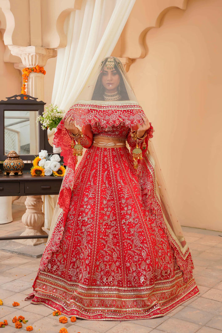 This elegant 3-piece unstitched lehenga set is crafted from premium net fabric, featuring heavily embroidered front and back panels adorned with gold tila, sequins, and panni work. The set includes a matching raw silk inner for a luxurious feel, along with intricately embroidered patches to enhance the overall design. Ideal for formal occasions, this ensemble is a perfect blend of tradition and modern craftsmanship, offering a timelessly stunning look.